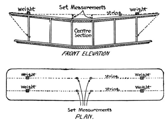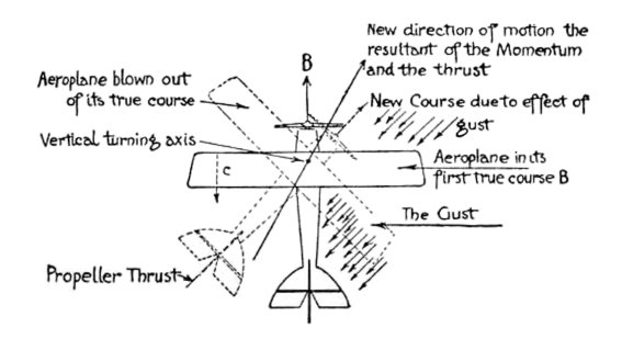 So the Chalk drew a nice long slim body to hold the Engine and the tanks, etc., with room for the Pilot's and Passenger's seats, and placed it exactly in the middle of the Biplane. And he was careful to make its position such that the Centre of Gravity was a little in advance of the Centre of Lift, so that when the Engine was not running and there was consequently no Thrust, the Aeroplane should be "nose-heavy" just to the right degree, and so take up a natural glide to Earth—and this was to help the Pilot and relieve him of work and worry, should he find himself in a fog or a cloud. And so that this tendency to glide downwards should not be in evidence when the Engine was running and descent not desired, the Thrust was placed a little below the Centre of Drift or Resistance. In this way it would in [12] a measure pull the nose of the Aeroplane up and counter-balance the "nose-heavy" tendency.
