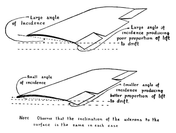 "Yes, indeed," spoke up the Propeller, "though it means that I must assume a most undignified attitude, for helicopters2 I never approved of. In order to ascend more quickly the Pilot will deflect the Elevator, which, by the way, you see hinged to the Tail. By that means he will force the whole Aeroplane to assume a greater Angle of Incidence. And with greater Angle, the Lift will increase, [13] though I'm sorry to say the Drift will increase also. Owing to the greater Drift, the Speed through the air will lessen, and I'm afraid that won't be helpful to the Lift; but I shall now be pointing upwards, and besides overcoming the Drift in a forward direction, I shall be doing my best to haul the Aeroplane skywards. At a certain angle known as the Best Climbing Angle, we shall have our Maximum Margin of Lift, and I'm hoping that may be as much as almost a thousand feet altitude a minute."