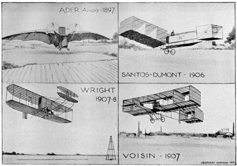 The first machine to fly—of which there is anything like authentic record—was the Ader "Avion," after which the more notable advances were made as shown above.