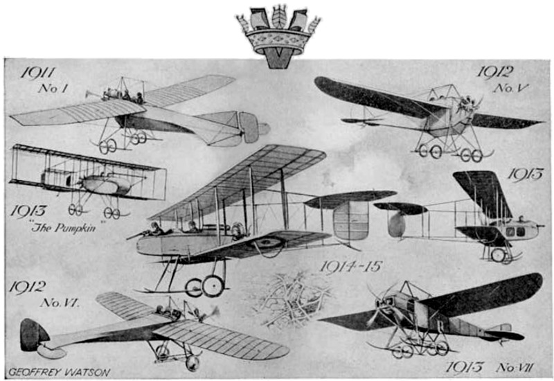 THE AVRO.—The aeroplane designed and built by Mr. A. V. Roe was the first successful heavier-than-air flying machine built by a British subject. Mr. Roe's progress may be followed in the picture, from his early "canard" biplane, through various triplanes, with 35 J.A.P. and 35 h.p. Green engines, to his successful tractor biplane with the same 35 h.p. Green, thence through the "totally enclosed" biplane 1912, with 60 h.p. Green, to the biplane 1913-14, with 80 h.p. Gnome.