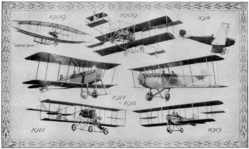 THE CURTISS BIPLANES.—In 1909 came the "June-bug," the united product of Glen Curtiss, Dr. Graham Bell, and J. A. D. McCurdy. Then the box-kite type, 1909, on which Mr. Curtiss won the Gordon-Bennett Race at Reims. Next the "rear-elevator" pusher, 1912, followed by first tractor, 1913, with an outside flywheel. All purely Curtiss machines to that date had independent ailerons intended to get away from Wright patents. Following these came tractors with engines varying from 70 to 160 h.p., fitted with varying types of chassis. All these have ordinary ailerons.