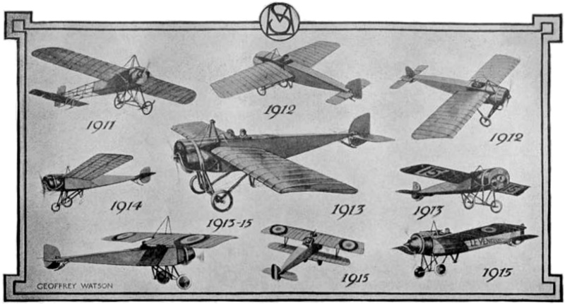 THE MAURICE FARMAN.—First, 1909, the 50-60 h.p. Renault and coil-spring chassis. 1910, the same chassis with beginning of the characteristic bent-up skids. 1911 appeared the huge French Military Trials 3-seater; also the round-ended planes and tails and "Henry" type wheels. This developed, 1912, into the square-ended planes and upper tail, and long double-acting ailerons of the British Military Trials. The 1913 type had two rectangular tail-planes and better seating arrangements, known affectionately as the "mechanical cow"; the same year came the first "shorthorn," with two tail-planes and a low nacelle. This finally developed into the carefully streamlined "shorthorn" with the raised nacelle and a single tail-plane.