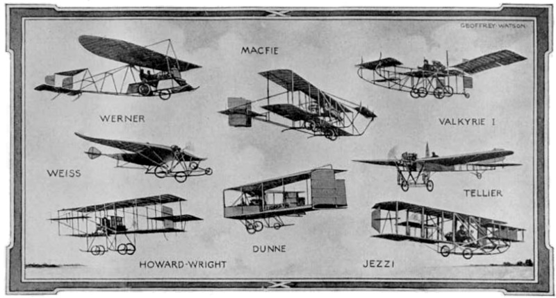 INTERESTING MACHINES, 1910.—The Werner monoplane with E.N.V. engine, combined shaft and chain drive, was a variant of the de Pischoff. The Macfie biplane was a conventional biplane with 50 h.p. Gnome and useful originalities. The Valkyrie monoplane, another British machine, was a "canard" monoplane with propeller behind the pilot and in front of main plane. The Weiss monoplane was a good British effort at inherent stability. The Tellier monoplane was a modified Bleriot with Antoinette proportions. The Howard Wright biplane was a pusher with large lifting monoplane tail. The Dunne biplane was another British attempt at inherent stability. The Jezzi biplane was an amateur built twin-propeller.