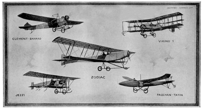 The Clement-Bayard monoplane, 1911, was convertible into a tractor biplane. The standard engine was a 50 h.p. Gnome. The machine was interesting, but never did much. The Zodiac was one of the earliest to employ staggered wings. With 50 h.p. Gnome engine it was badly underpowered, so never did itself justice. The Jezzi tractor biplane, 1911, was a development of an earlier model built entirely by Mr. Jezzi, an amateur constructor. With a low-powered J.A.P. engine it developed an amazing turn of speed, and it may be regarded as a forerunner of the scout type and the properly streamlined aeroplane. The Paulhan-Tatin monoplane, 1911, was a brilliant attempt at high speed for low power; it presented certain advantages as a scout. A 50 h.p. Gnome, fitted behind the pilot's seat in the streamlined fuselage, was cooled through louvres. The propeller at the end of the tail was connected with the engine by a flexible coupling. This machine was, in its day, the fastest for its power in the world, doing 80 miles per hour. Viking 1 was a twin tractor biplane driven by a 50 h.p. Gnome engine through chains. It was built by the author at Hendon in 1912.