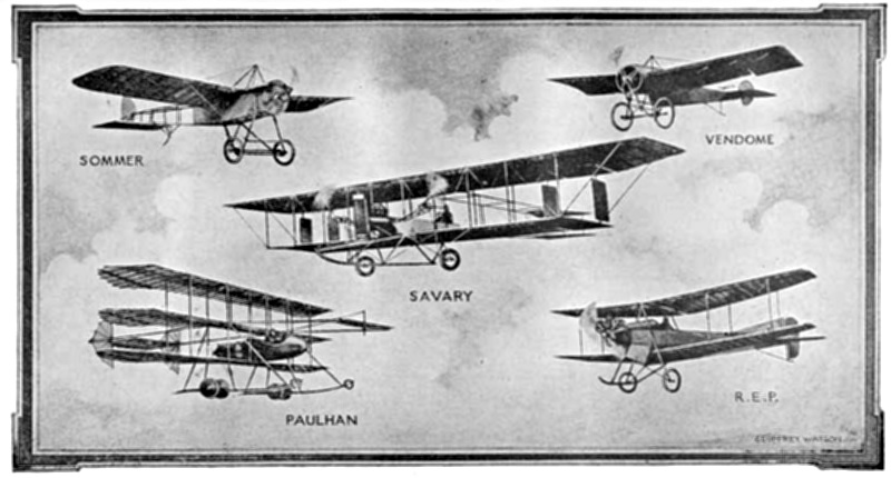 The Sommer monoplane, with 50 h.p. Gnome, was a 1911-12 machine; it did a good deal of cross-country flying. The Vendome monoplane of 1912, also with 50 h.p. Gnome engine, was notable chiefly for its large wheels and jointed fuselage, which enabled the machine to be taken down for transport. The Savary biplane took part in the French Military Trials, 1911. It had a four-cylinder Labor aviation motor. Notable features are twin chain-driven propellers, rudders between the main planes, the broad wheel-base and the position of the pilot. The Paulhan triplane, which also figured in the French Military Trials, was a development of the Paulhan folding biplane. It had a 70 h.p. Renault engine. For practical purposes it was a failure. The R.E.P. biplane, with 60 h.p. R.E.P. engine, was a development of the famous R.E.P. monoplanes. Its spring chassis, with sliding joints, marked an advance. Like the monoplanes, it was built largely of steel.
