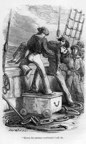 Before long, boy Gerrard was seen staggering along the deck towards the berth with a huge piece of salt beef in his hands, and endeavouring to keep his legs as the frigate gave a heavy lurch or pitched forward, as she forced her way over the tumultuous seas. Boy Gerrard gazed at the berth of his many masters. He thought that he could reach it in another run. He made the attempt, but it was down hill, and before he could save himself he had shot the beef, though not the dish, into the very centre of the table, whence it bounded off and hit O’Grady, the Irish midshipman, a blow on the eye, which knocked him backward. Poor Gerrard stood gazing into the berth, and prepared for the speedy punishment which his past experience had taught him would follow.