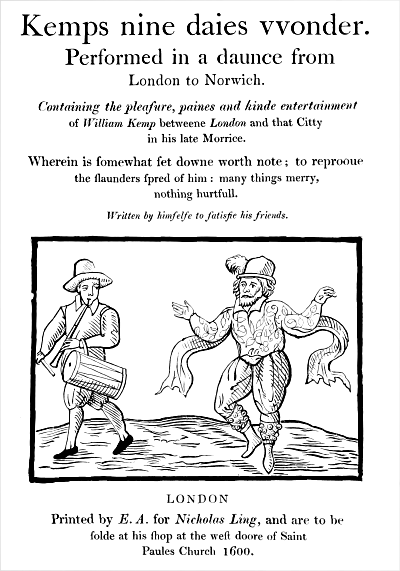 In 1599 Kemp attracted much attention by dancing the morris from London to Norwich; and as well to refute the lying ballads put forth concerning this exploit, as to testify his gratitude for the favours he had received during his “gambols,”vii:2 he published in the following year the curious pamphlet which is now reprinted. A Nine daies wonder was thus entered in the Stationers’ Books:
