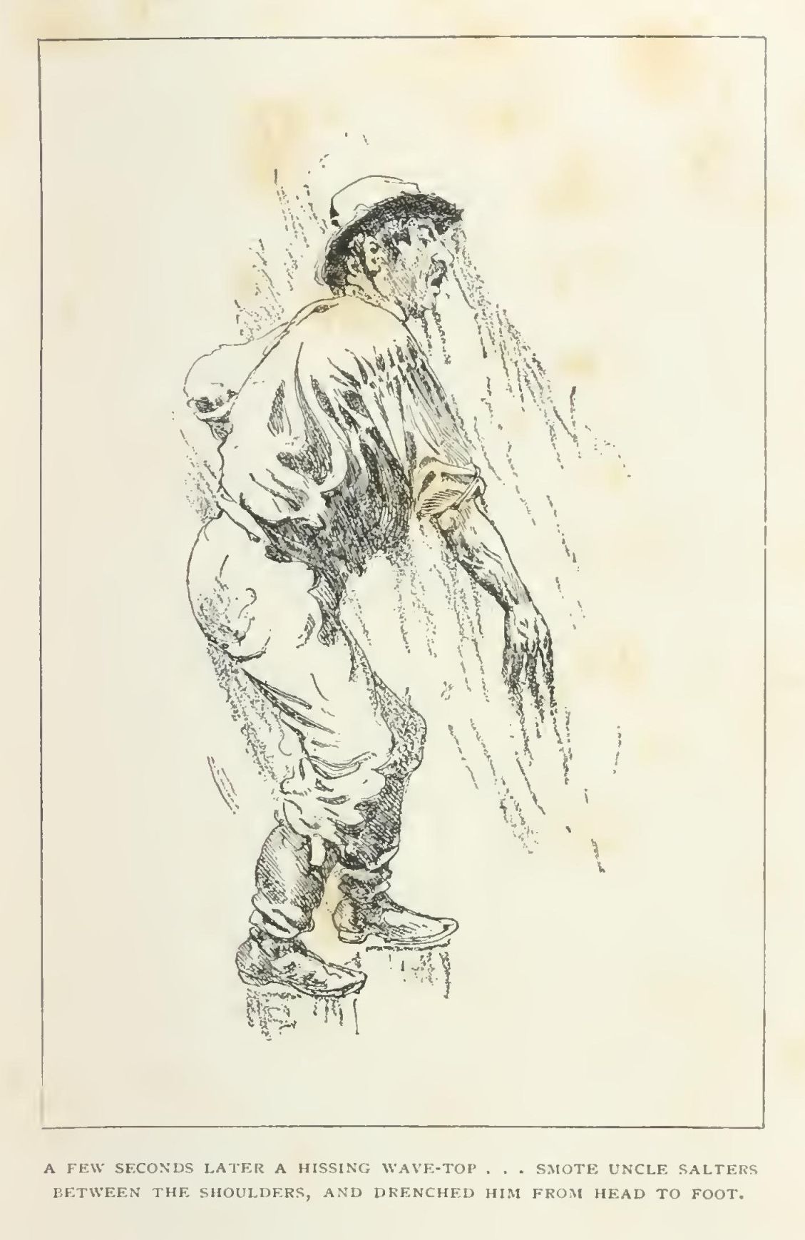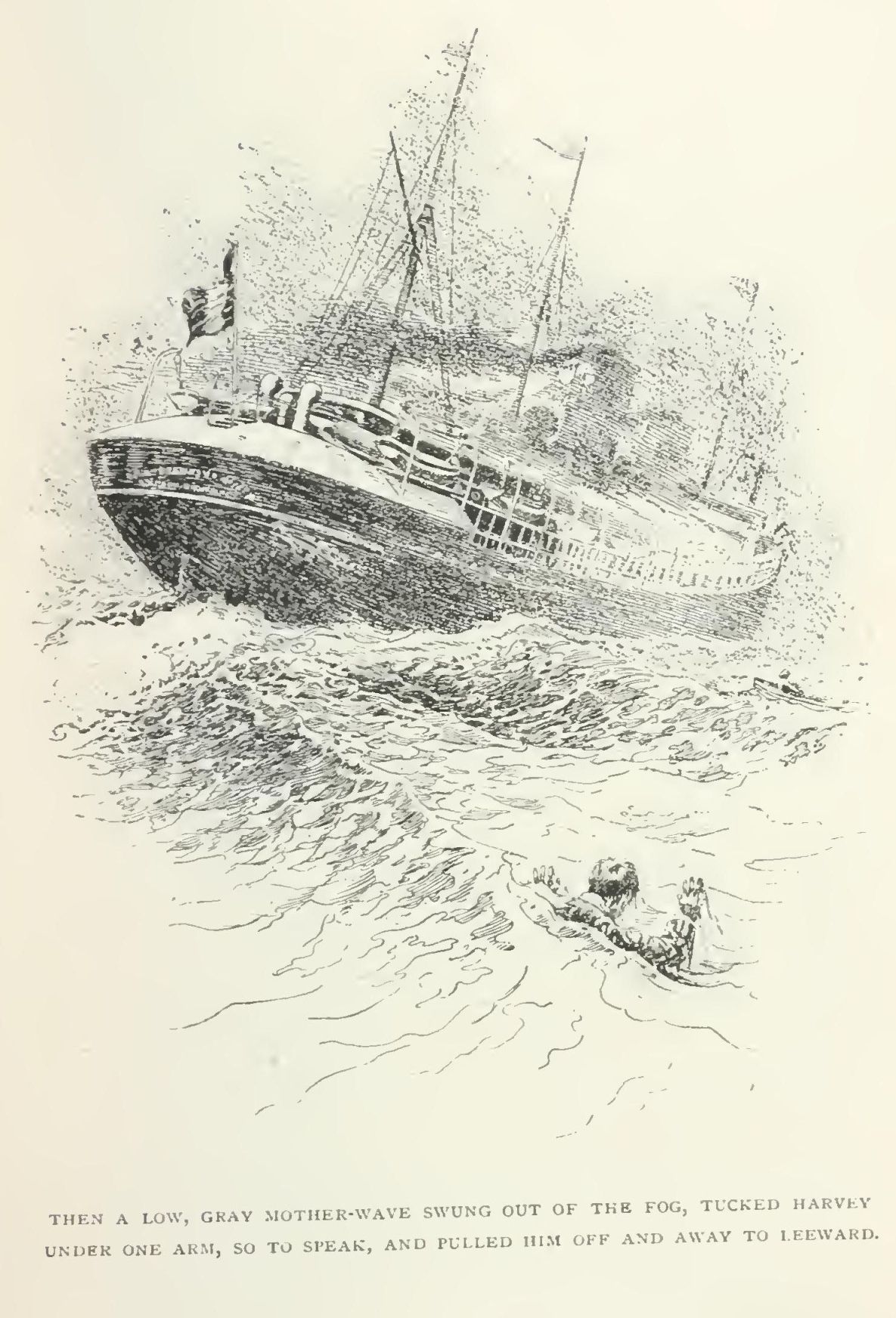 Harvey staggered over the wet decks to the nearest rail. He was very unhappy; but he saw the deck-steward lashing chairs together, and, since he had boasted before the man that he was never seasick, his pride made him go aft to the second-saloon deck at the stern, which was finished in a turtle-back. The deck was deserted, and he crawled to the extreme end of it, near the flagpole. There he doubled up in limp agony, for the Wheeling "stogie" joined with the surge and jar of the screw to sieve out his soul. His head swelled; sparks of fire danced before his eyes; his body seemed to lose weight, while his heels wavered in the breeze. He was fainting from seasickness, and a roll of the ship tilted him over the rail on to the smooth lip of the turtle-back. Then a low, grey mother-wave swung out of the fog, tucked Harvey under one arm, so to speak, and pulled him off and away to leeward; the great green closed over him, and he went quietly to sleep.