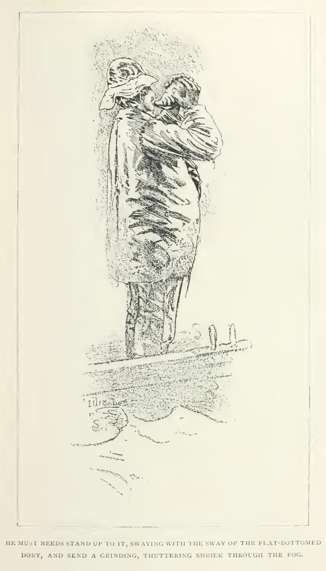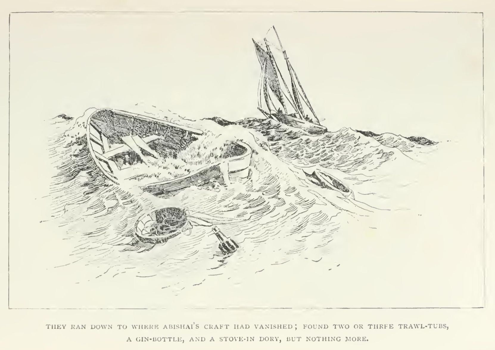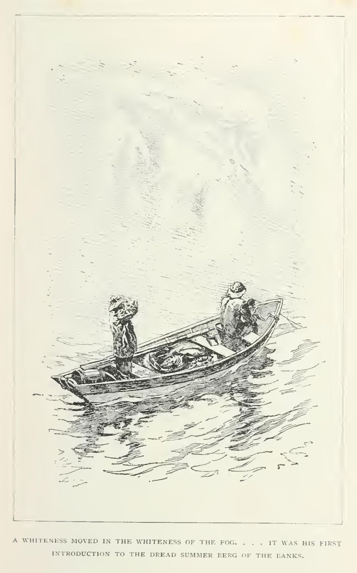 He seemed to have two pairs of hands and a head of cast-iron, for, not content with blowing through a big conch-shell, he must needs stand up to it, swaying with the sway of the flat-bottomed dory, and send a grinding, thuttering shriek through the fog. How long this entertainment lasted, Harvey could not remember, for he lay back terrified at the sight of the smoking swells. He fancied he heard a gun and a horn and shouting. Something bigger than the dory, but quite as lively, loomed alongside. Several voices talked at once; he was dropped into a dark, heaving hole, where men in oilskins gave him a hot drink and took off his clothes, and he fell asleep.