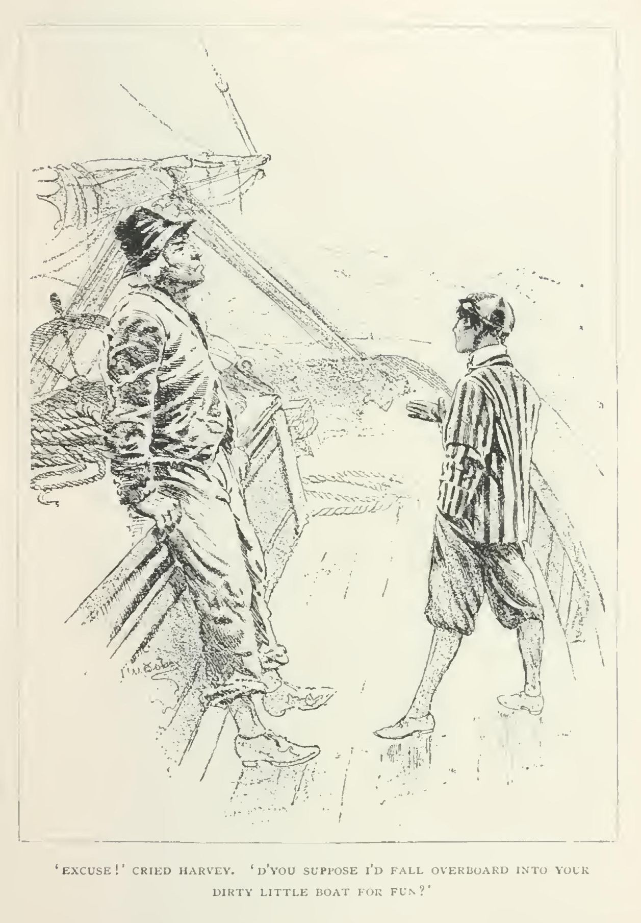 "Excuse!" cried Harvey. "D'you suppose I'd fall overboard into your dirty little boat for fun?"
