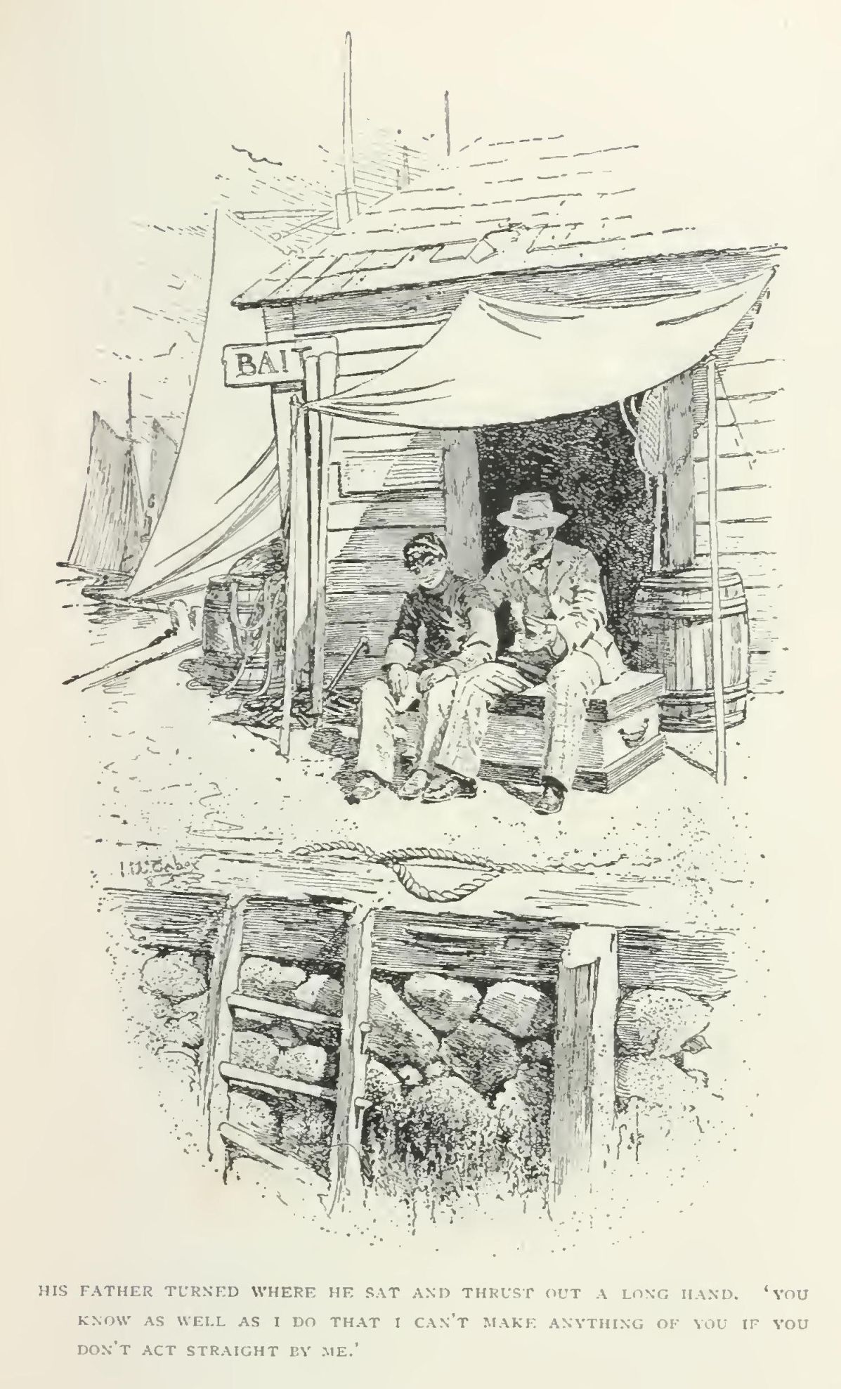 When he waked he listened for the first breakfast-bell on the steamer, wondering why his stateroom had grown so small. Turning, he looked into a narrow, triangular cave, lit by a lamp hung against a huge square beam. A three-cornered table within arm's reach ran from the angle of the bows to the foremast. At the after end, behind a well-used Plymouth stove, sat a boy about his own age, with a flat red face and a pair of twinkling grey eyes. He was dressed in a blue jersey and high rubber boots. Several pairs of the same sort of foot-wear, an old cap, and some worn-out woolen socks lay on the floor, and black and yellow oilskins swayed to and fro beside the bunks. The place was packed as full of smells as a bale is of cotton. The oilskins had a peculiarly thick flavour of their own which made a sort of background to the smells of fried fish, burnt grease, paint, pepper, and stale tobacco; but these, again, were all hooped together by one encircling smell of ship and salt water. Harvey saw with disgust that there were no sheets on his bed-place. He was lying on a piece of dingy ticking full of lumps and nubbles. Then, too, the boat's motion was not that of a steamer. She was neither sliding nor rolling, but rather wriggling herself about in a silly, aimless way, like a colt at the end of a halter. Water-noises ran by close to his ear, and beams creaked and whined about him. All these things made him grunt despairingly and think of his mother.