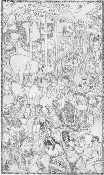 Sobald die Verschnittenen zum Tore von Alaeddins Palast herauskamen und auf den afrikanischen Zauberer zugingen, so wich die Menge auseinander, und als dieser sich nun frei und die Verschnittenen auf sich zukommen sah, so ging er ihnen mit um so größerer Freude entgegen, da sein Schelmstück ihm einen guten Anfang zu nehmen schien. Einer von den Verschnittenen nahm das Wort und sagte: »Heilige Frau, die Prinzessin wünscht dich zu sprechen; komm und folge uns.« – »Die Prinzessin erzeigt mir viele Ehre,« antwortete die angebliche Fatime; »ich bin bereit, ihr zu gehorchen.« Mit diesen Worten folgte er den Verschnittenen.
