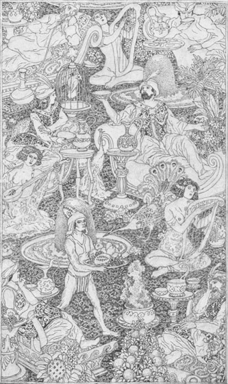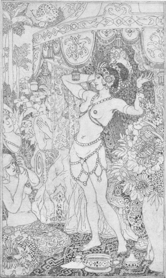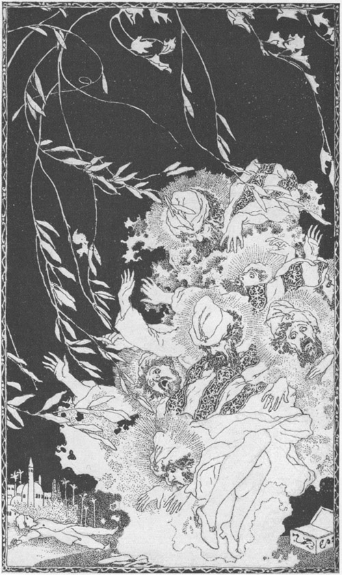 Prinzessin Bedrulbudur führte nun den Becher an den Mund, berührte ihn aber nur mit den Lippen, indes der afrikanische Zauberer sich sehr bemühte, es ihr zuvor zu tun, und den seinigen ausleerte, ohne einen Tropfen darin zu lassen. Die Prinzessin sah, daß seine Augen sich verdrehten und er ohne Bewußtsein rücklings zusammensank.
