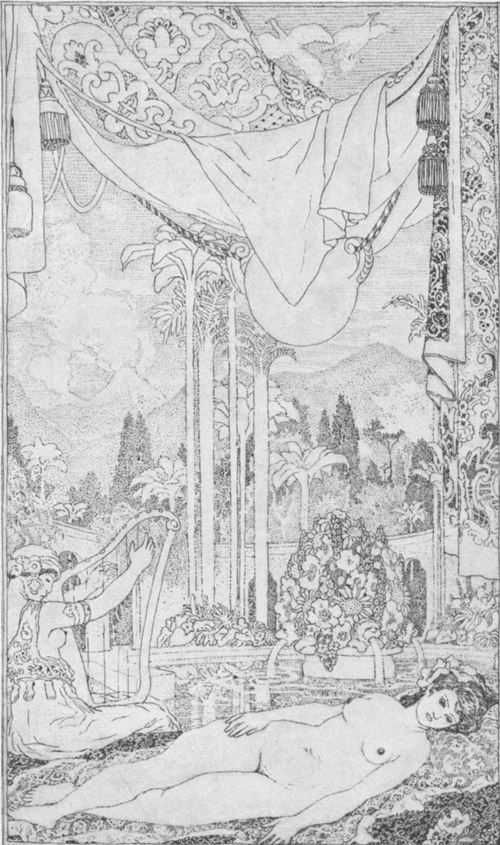 Alaeddin verlor keines von den letzten Worten des Geistes. Er hatte von der heiligen Frau Fatime sagen gehört und wußte recht gut, wie sie dem allgemeinen Glauben zufolge das Kopfweh heilte. Er ging nun aufs Zimmer der Prinzessin zurück, und ohne ein Wort von dem zu sprechen, was ihm soeben begegnet[124] war, setzte er sich nieder, stützte seine Stirne auf die Hand und sagte, es habe ihn plötzlich ein heftiges Kopfweh befallen. Die Prinzessin befahl sogleich, die heilige Frau zu rufen, und während sie geholt wurde, erzählte sie Alaeddin, wie sie in den Palast gekommen sei und wie sie ihr darin ein Zimmer eingeräumt habe.
