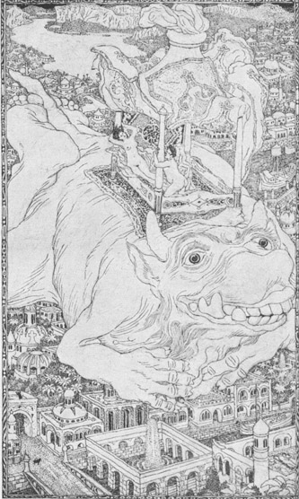 [122]»Meine gute Mutter,« fragte die Prinzessin, »was für ein Vogel ist denn der Roch, und woher könnte man wohl ein Ei von ihm bekommen?« – »Prinzessin,« antwortete die falsche Fatime, »es ist dies ein Vogel von bewundernswürdiger Größe, der auf der höchsten Spitze des Berges Kaukasus wohnt; der Baumeister dieses Palastes wird dir schon ein solches Ei verschaffen.«