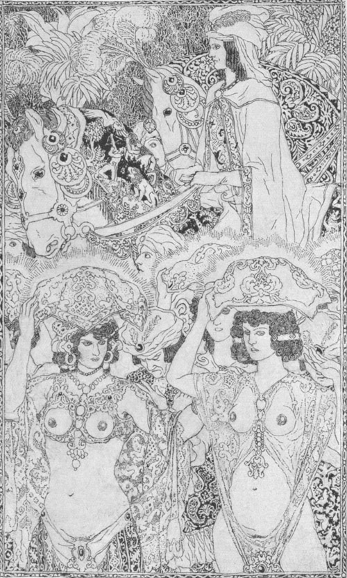 Als der Zauberer, der unter dem heiligen Kleide ein teuflisches Herz verbarg, in den Saal mit den vierundzwanzig Fenstern eintrat und die Prinzessin bemerkte, begann er mit einem Gebet, das eine lange Reihe von Wünschen für ihr Wohlbefinden,[120] ihr Glück und die Erfüllung alles dessen, was sie nur begehren könnte, enthielt. Hierauf entfaltete er all seine trügerische und heuchlerische Beredsamkeit, um sich unter dem Mantel großer Frömmigkeit ins Herz der Prinzessin einzuschleichen, was ihm auch um so leichter gelang, als die Prinzessin in ihrer natürlichen Gutherzigkeit die Überzeugung hatte, alle Leute müßten ebenso gut sein, wie sie, besonders aber diejenigen Männer und Frauen, die es sich zur Pflicht machten, Gott in der Einsamkeit zu dienen.