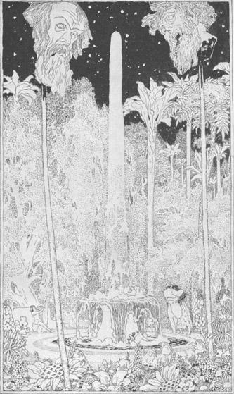Am andern Morgen stand Alaeddin in aller Frühe auf. Der afrikanische Zauberer bewillkommte ihn aufs freundlichste. »Wohlan, mein lieber Junge,« sagte er mit lächelnder Miene zu ihm, »heute werde ich dir schöne Sachen zeigen.« Er führte ihn zu einem Tore hinaus, an großen und schönen Häusern, an prächtigen Palästen vorüber, von denen jeder einen sehr schönen Garten hatte. Bei jedem Palaste, an dem sie vorbeikamen, fragte er Alaeddin, ob er ihm gefiele, und Alaeddin, der ihm gewöhnlich zuvorkam, sagte, sobald er wieder einen andern sah: »Ach! lieber Oheim, dieser ist noch viel schöner als alle bisherigen.« Indes gingen sie immer weiter, und der listige Zauberer, der dies nur tat, um den Plan, den er im Kopfe hatte, ausführen zu können, nahm Gelegenheit, in einen dieser Gärten zu treten. Er setzte sich neben ein großes Becken, in das durch einen bronzenen Löwenrachen kristallhelles Wasser sprudelte, und er stellte sich ermüdet, damit Alaeddin ebenfalls ausruhen sollte. »Lieber Neffe,« sagte er zu ihm, »du wirst ebenso müde sein, wie ich; laß uns hier ein wenig ausruhen, um neue Kräfte zu sammeln.«