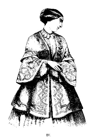 IV. Velvet mantelet, with arabesque in silk braiding, a quarter of an inch wide, and satin stitch, slightly fitting to the waist; wide sleeves, and entirely embroidered.