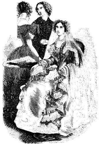A sortie de bal of cerulean blue satin, edged with a broad band of velvet of the same color, on which a braid is disposed in a zigzag pattern. The headdress of loops of narrow blue velvet ribbon fixed on each side of the head. (III.) Bride's dress suited to the Nuptial Ceremony.—Robe of white satin; the skirt ornamented with side trimmings, consisting each of a row of lace, headed by a fronce of white satin ribbon. This trimming is set on spirally up each side of the skirt, and is attached at intervals by small bows of white satin ribbon. The corsage is half high at the back, and is sloped somewhat lower in front. The front of the corsage is trimmed with rows of lace set on horizontally. On the neck is worn a chemisette of lace. The sleeves are finished at the ends with a full trimming of white satin ribbon. The under-sleeves are loose at the ends, and are edged with two rows of lace. On each arm a bracelet of gold, one of the serpent pattern, and the other fastened by a cameo snap. Bridal wreath of orange-blossom and jasmin. A very large veil of tulle illusion is fixed under the wreath instead of being thrown over it, as is sometimes customary.