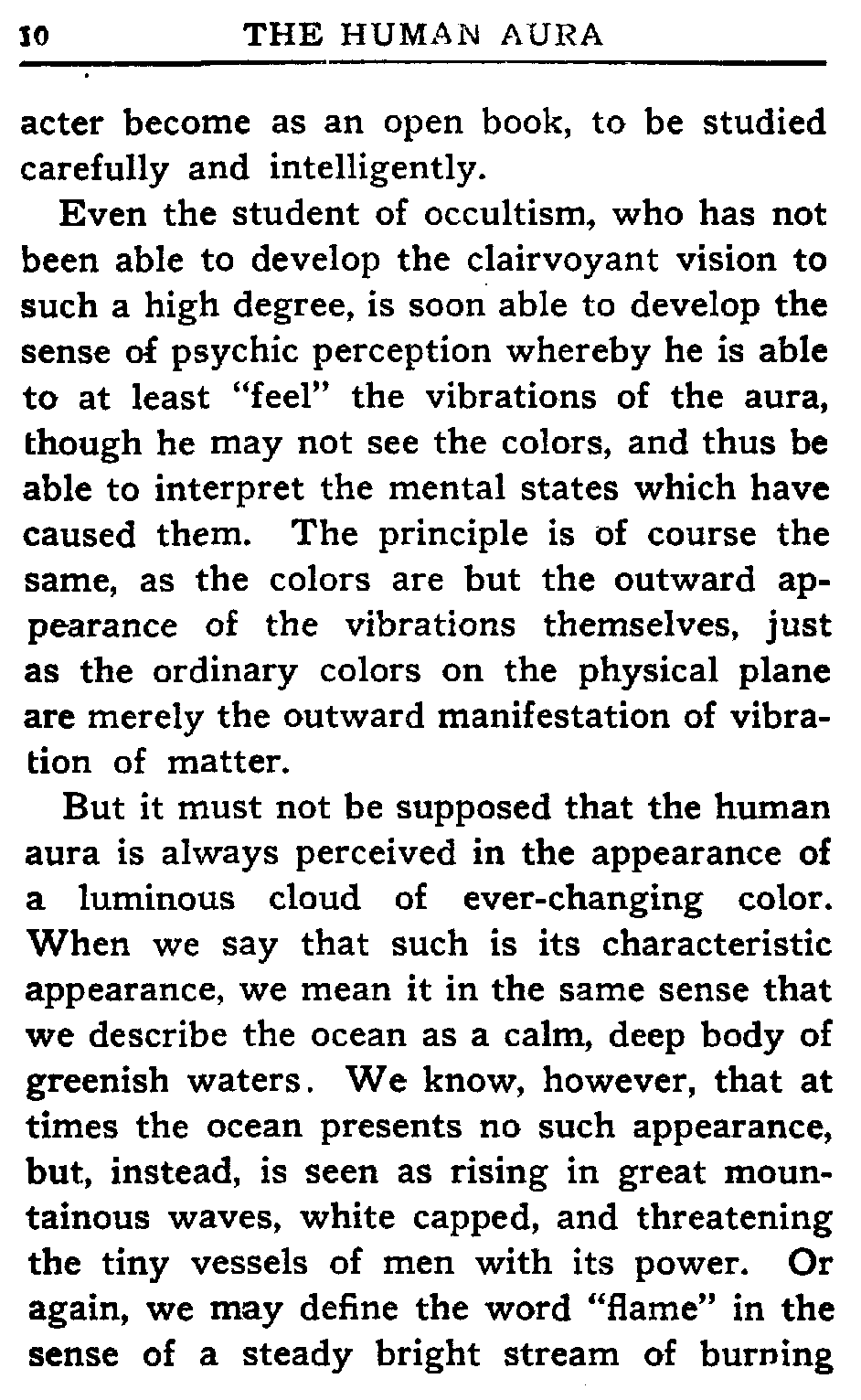 Even the student of occultism, who has not been able to develop the clairvoyant vision to such a high degree, is soon able to develop the sense of psychic perception whereby he is able to at least "feel" the vibrations of the aura, though he may not see the colors, and thus be able to interpret the mental states which have caused them. The principle is of course the same, as the colors are but the outward appearance of the vibrations themselves, just as the ordinary colors on the physical plane are merely the outward manifestation of vibration of matter.