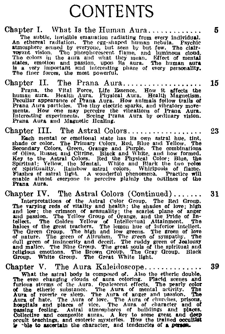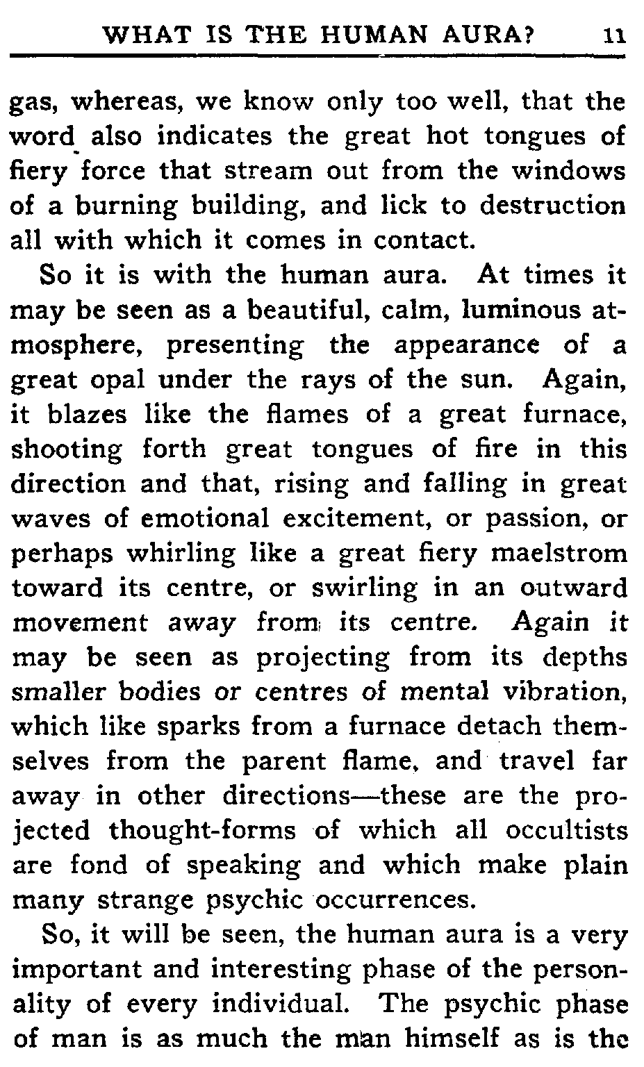 The subtle, invisible emanation radiating from every individual. An ethereal radiation. The egg-shaped human nebula. Psychic atmosphere sensed by everyone, but seen by but few. The clairvoyant vision. The phosphorescent flame, and luminous cloud. The colors in the aura and what they mean. Effect of mental states, emotion and passion, upon its aura. The human aura is a very important and interesting phase of every personality. The finer forces, the most powerful.