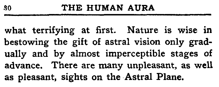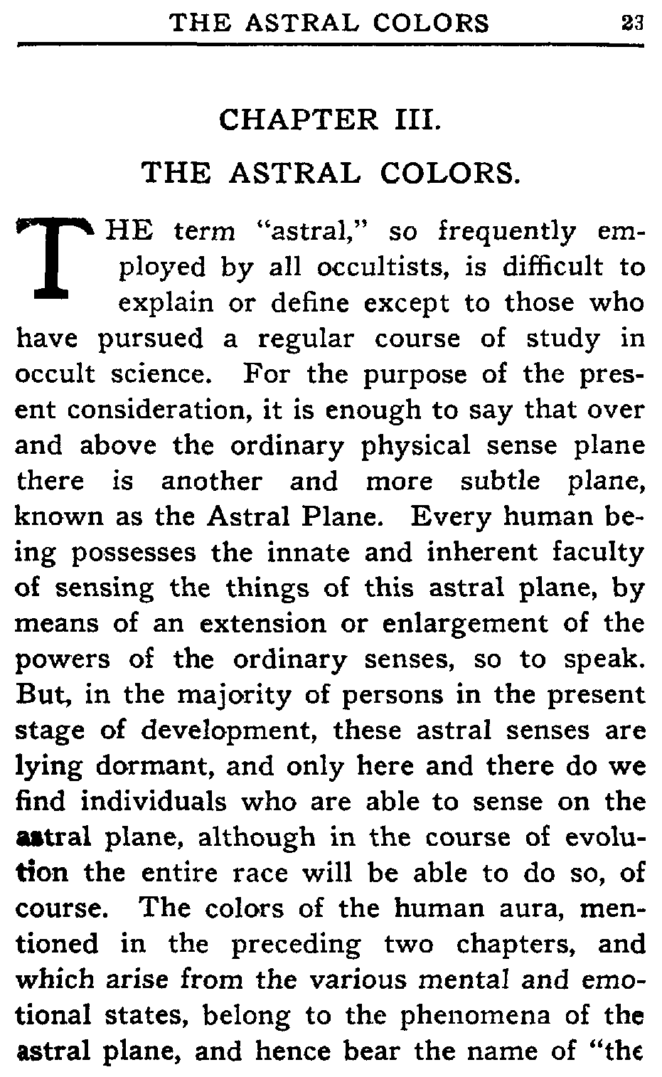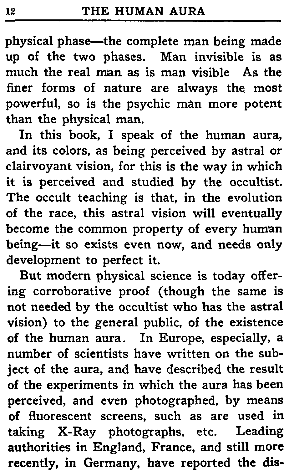 In this book, I speak of the human aura, and its colors, as being perceived by astral or clairvoyant vision, for this is the way in which it is perceived and studied by the occultist. The occult teaching is that, in the evolution of the race, this astral vision will eventually become the common property of every human being—it so exists even now, and needs only development to perfect it.