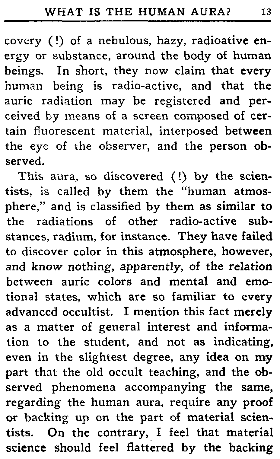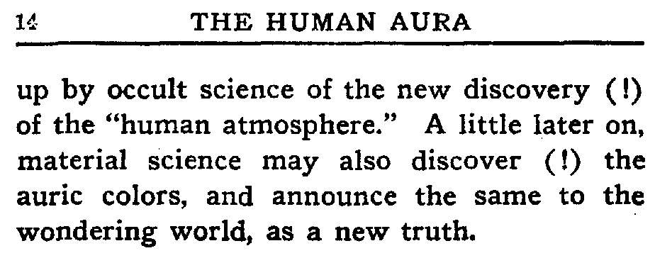 This aura, so discovered (!) by the scientists, is called by them the "human atmosphere," and is classified by them as similar to the radiations of other radio-active substances, radium, for instance. They have failed to discover color in this atmosphere, however, and know nothing, apparently, of the relation between auric colors and mental and emotional states, which are so familiar to every advanced occultist. I mention this fact merely as a matter of general interest and information to the student, and not as indicating, even in the slightest degree, any idea on my part that the old occult teaching, and the observed phenomena accompanying the same, regarding the human aura, require any proof or backing up on the part of material scientists. On the contrary, I feel that material science should feel flattered by the backing[14] up by occult science of the new discovery (!) of the "human atmosphere." A little later on, material science may also discover (!) the auric colors, and announce the same to the wondering world, as a new truth.