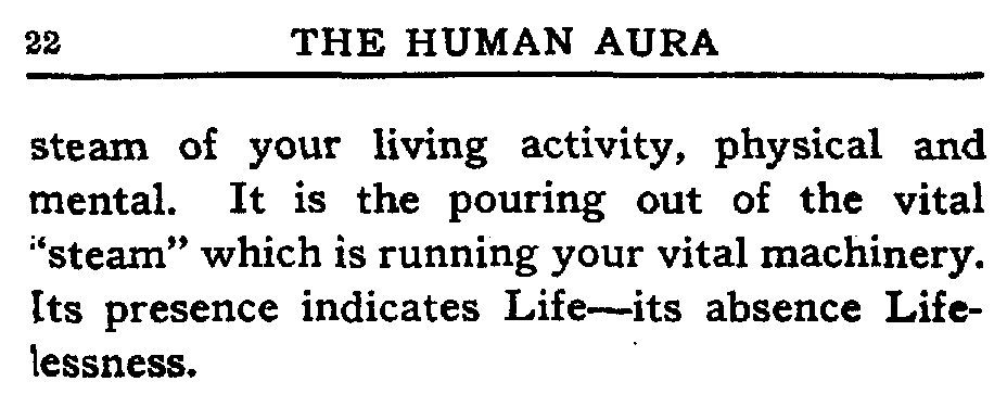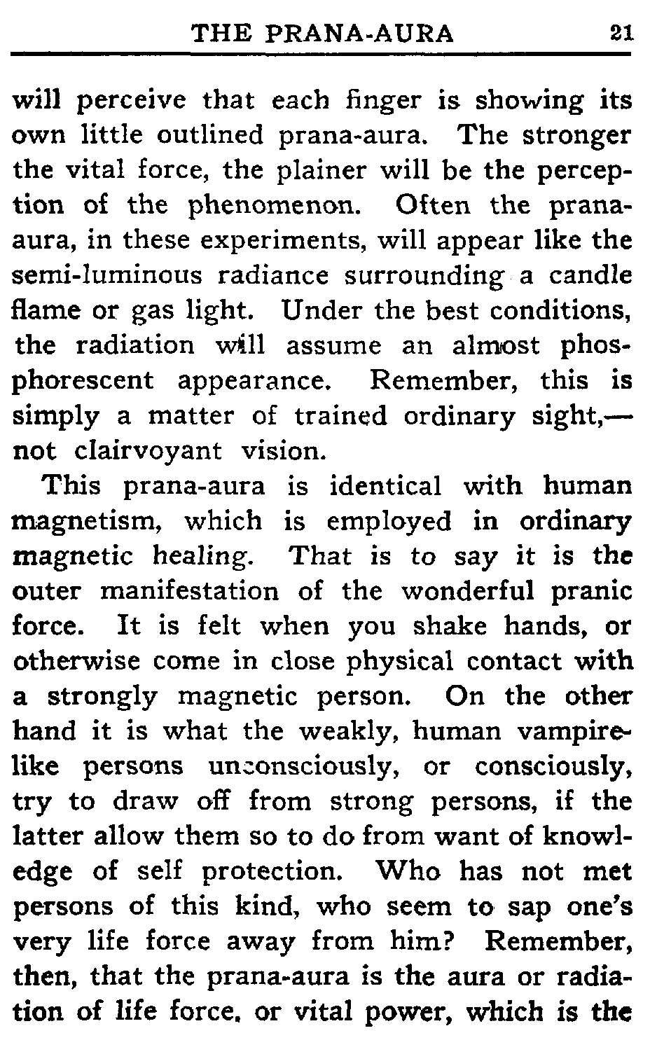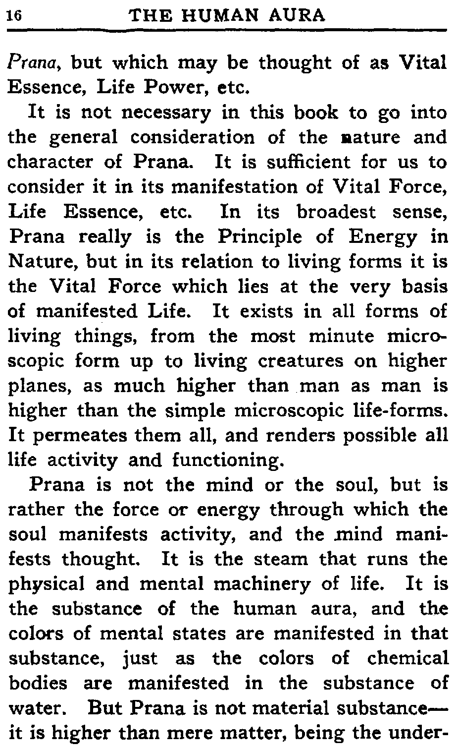 The fundamental substance of which the human aura is composed is none other than that wonderful principle of nature of which one reads so much in all occult writings, which has been called by many names, but which is perhaps best known under the Sanscrit term,[16] Prana, but which may be thought of as Vital Essence, Life Power, etc.