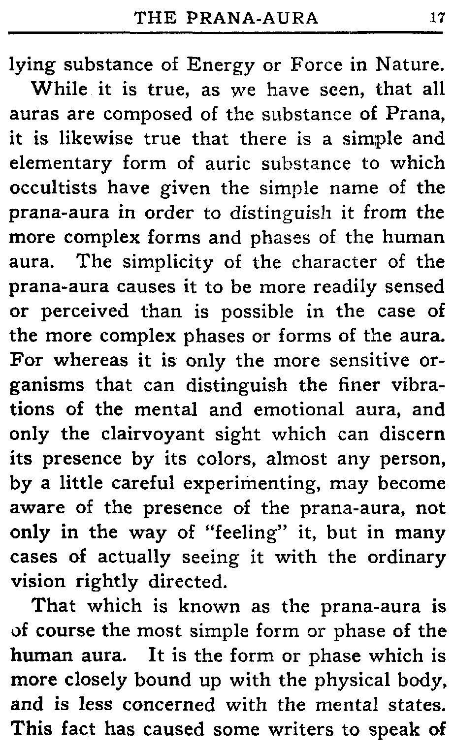 While it is true, as we have seen, that all auras are composed of the substance of Prana, it is likewise true that there is a simple and elementary form of auric substance to which occultists have given the simple name of the prana-aura in order to distinguish it from the more complex forms and phases of the human aura. The simplicity of the character of the prana-aura causes it to be more readily sensed or perceived than is possible in the case of the more complex phases or forms of the aura. For whereas it is only the more sensitive organisms that can distinguish the finer vibrations of the mental and emotional aura, and only the clairvoyant sight which can discern its presence by its colors, almost any person, by a little careful experimenting, may become aware of the presence of the prana-aura, not only in the way of "feeling" it, but in many cases of actually seeing it with the ordinary vision rightly directed.