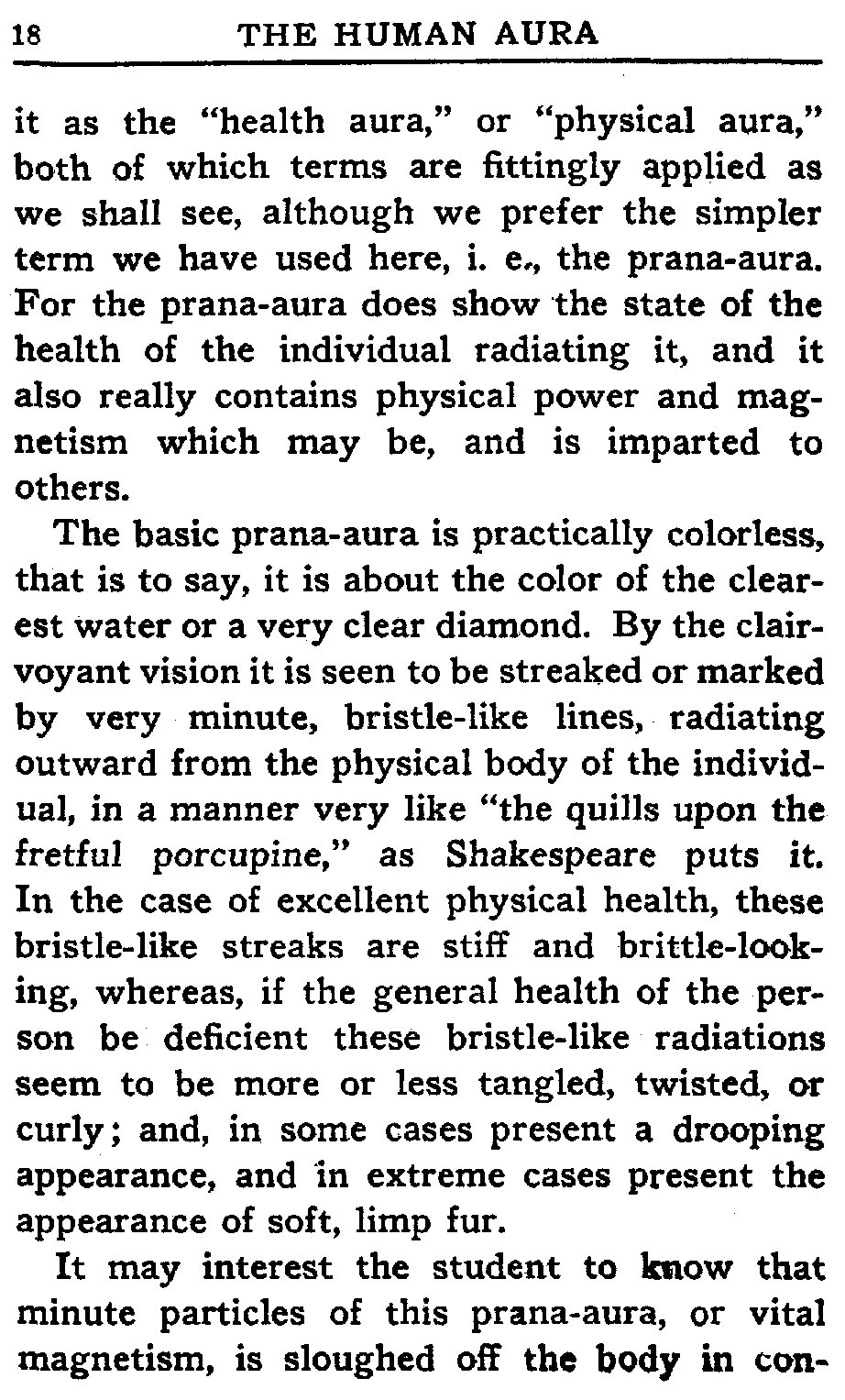 The basic prana-aura is practically colorless, that is to say, it is about the color of the clearest water or a very clear diamond. By the clairvoyant vision it is seen to be streaked or marked by very minute, bristle-like lines, radiating outward from the physical body of the individual, in a manner very like "the quills upon the fretful porcupine," as Shakespeare puts it. In the case of excellent physical health, these bristle-like streaks are stiff and brittle-looking, whereas, if the general health of the person be deficient these bristle-like radiations seem to be more or less tangled, twisted, or curly; and, in some cases present a drooping appearance, and in extreme cases present the appearance of soft, limp fur.