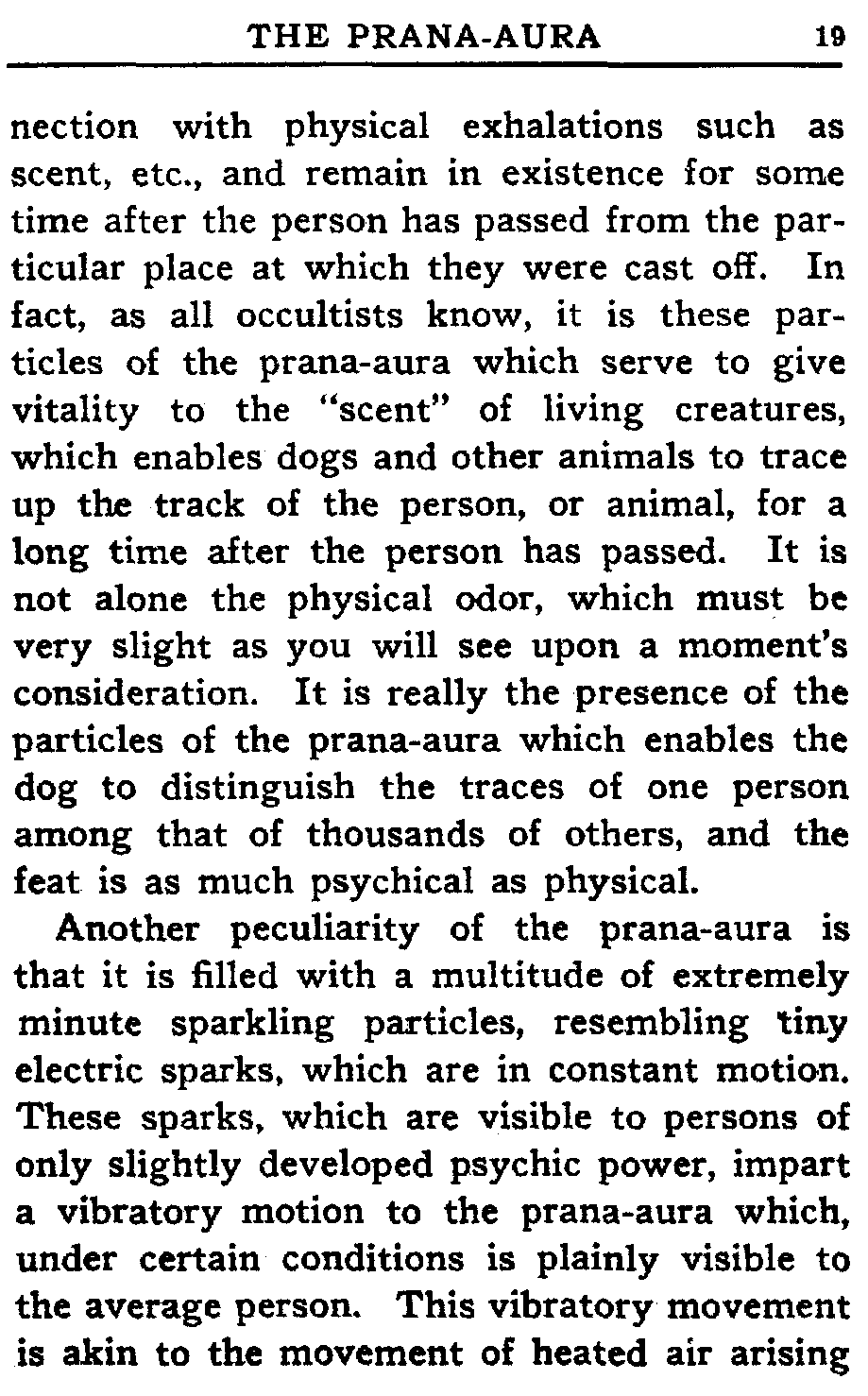 It may interest the student to know that minute particles of this prana-aura, or vital magnetism, is sloughed off the body in connection[19] with physical exhalations such as scent, etc., and remain in existence for some time after the person has passed from the particular place at which they were cast off. In fact, as all occultists know, it is these particles of the prana-aura which serve to give vitality to the "scent" of living creatures, which enables dogs and other animals to trace up the track of the person, or animal, for a long time after the person has passed. It is not alone the physical odor, which must be very slight as you will see upon a moment's consideration. It is really the presence of the particles of the prana-aura which enables the dog to distinguish the traces of one person among that of thousands of others, and the feat is as much psychical as physical.