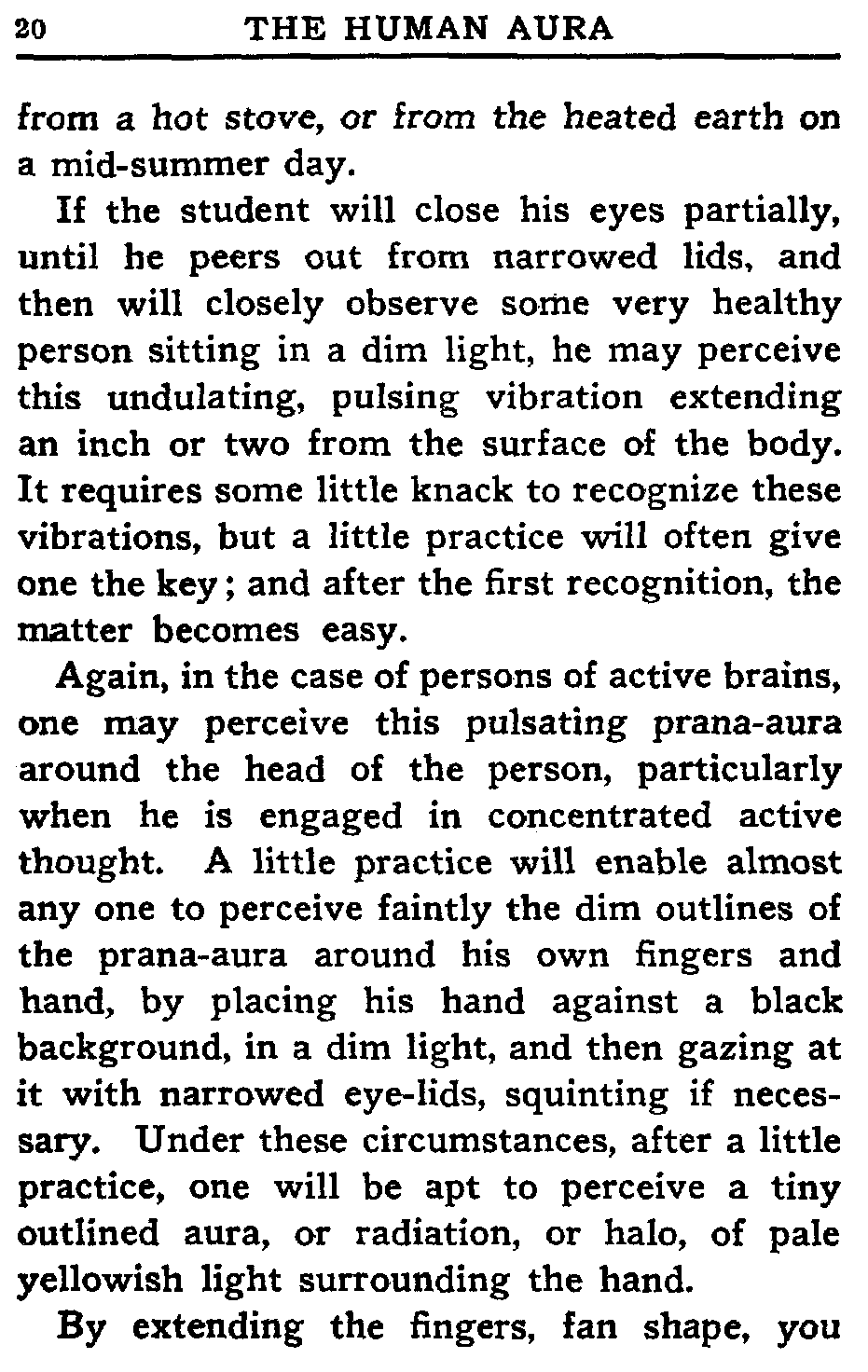 Again, in the case of persons of active brains, one may perceive this pulsating prana-aura around the head of the person, particularly when he is engaged in concentrated active thought. A little practice will enable almost any one to perceive faintly the dim outlines of the prana-aura around his own fingers and hand, by placing his hand against a black background, in a dim light, and then gazing at it with narrowed eye-lids, squinting if necessary. Under these circumstances, after a little practice, one will be apt to perceive a tiny outlined aura, or radiation, or halo, of pale yellowish light surrounding the hand.