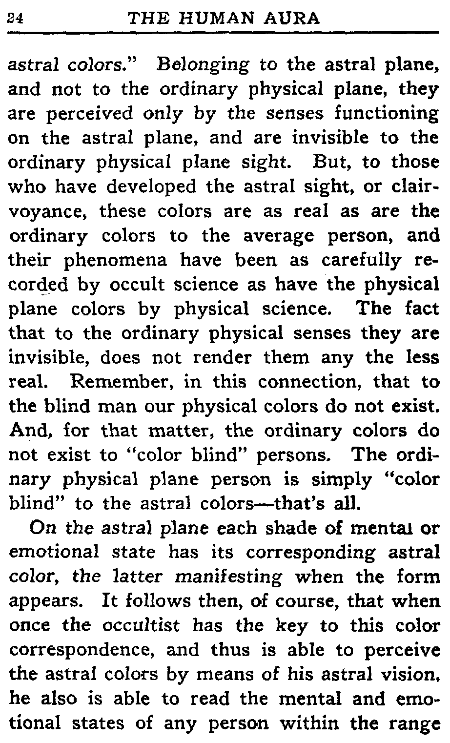 On the astral plane each shade of mental or emotional state has its corresponding astral color, the latter manifesting when the form appears. It follows then, of course, that when once the occultist has the key to this color correspondence, and thus is able to perceive the astral colors by means of his astral vision, he also is able to read the mental and emotional states of any person within the range[25] of his vision, as easily as you are now reading the printed words of this book.