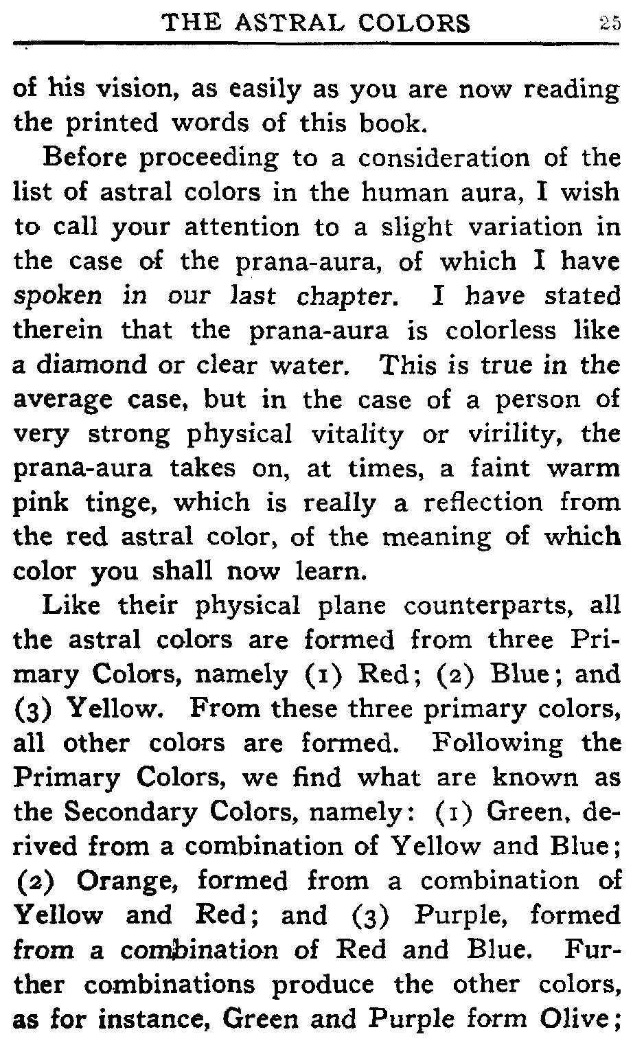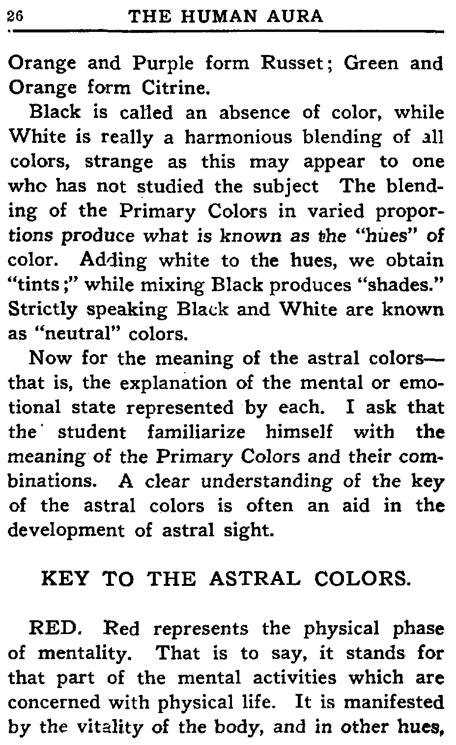 Each mental or emotional state has its own astral hue, tint, shade or color. The Primary Colors, Red, Blue and Yellow. The Secondary Colors, Green, Orange and Purple. The combinations of Olive, Russet and Citrine. Black and White, and how formed. Key to the Astral Colors. Red the Physical Color; Blue, the Spiritual; Yellow, the Mental. White and Black the two poles of Spirituality. Rainbow astral colors. Whirlpools of flame. Flashes of astral light. A wonderful phenomena. Practice will enable almost everyone to perceive plainly the outlines of the Prana Aura.