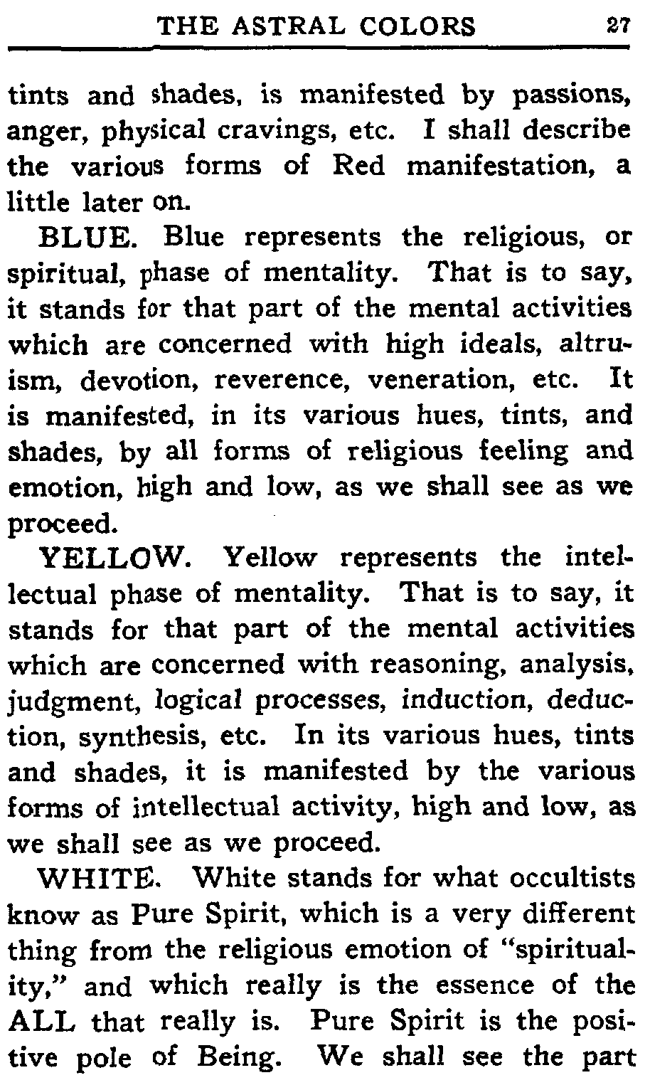 Remembering, always, the significance of the three primary colors on the astral plane, let us consider the meaning of the combinations, shades, hues, and tints of these colors.