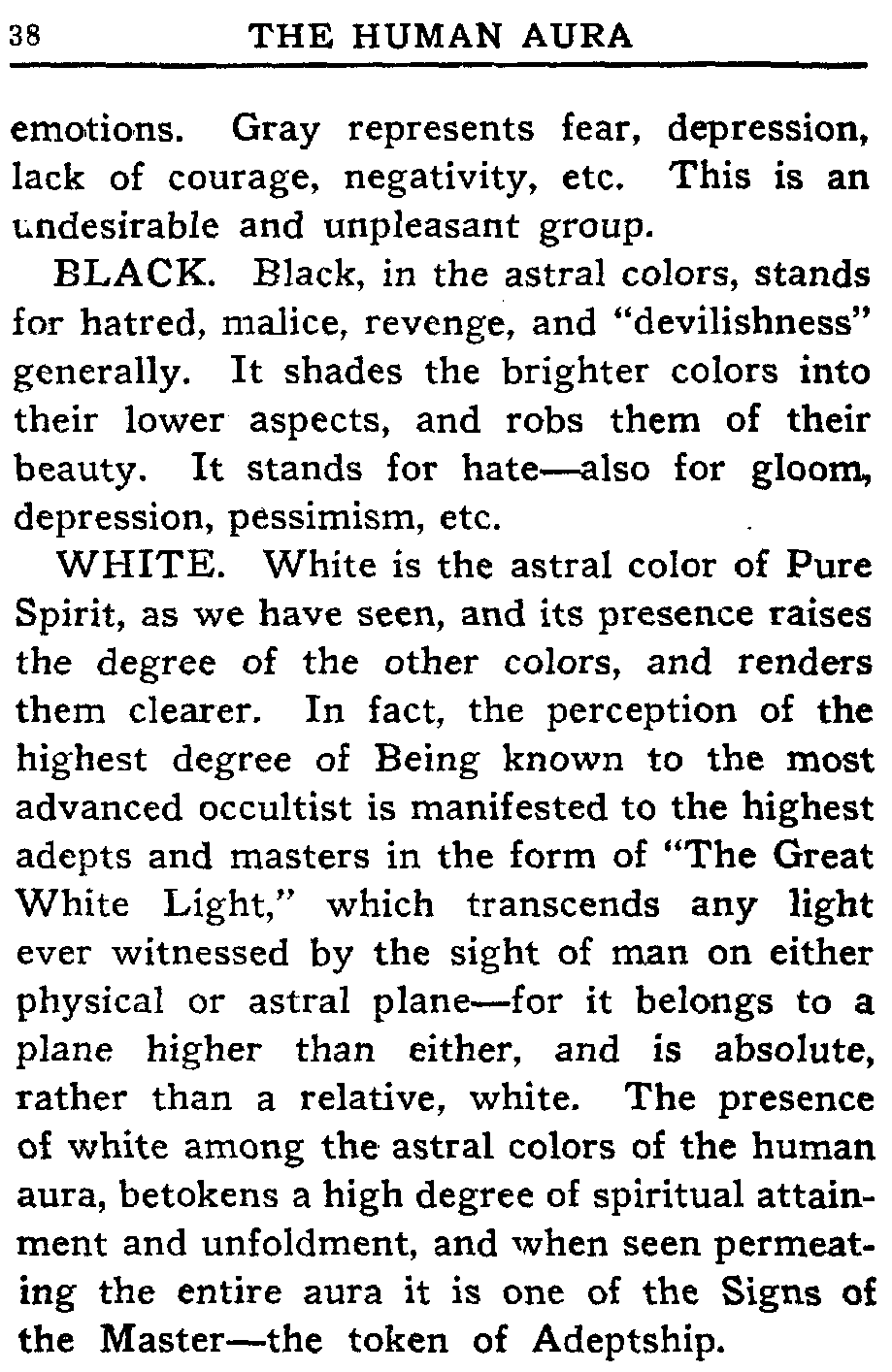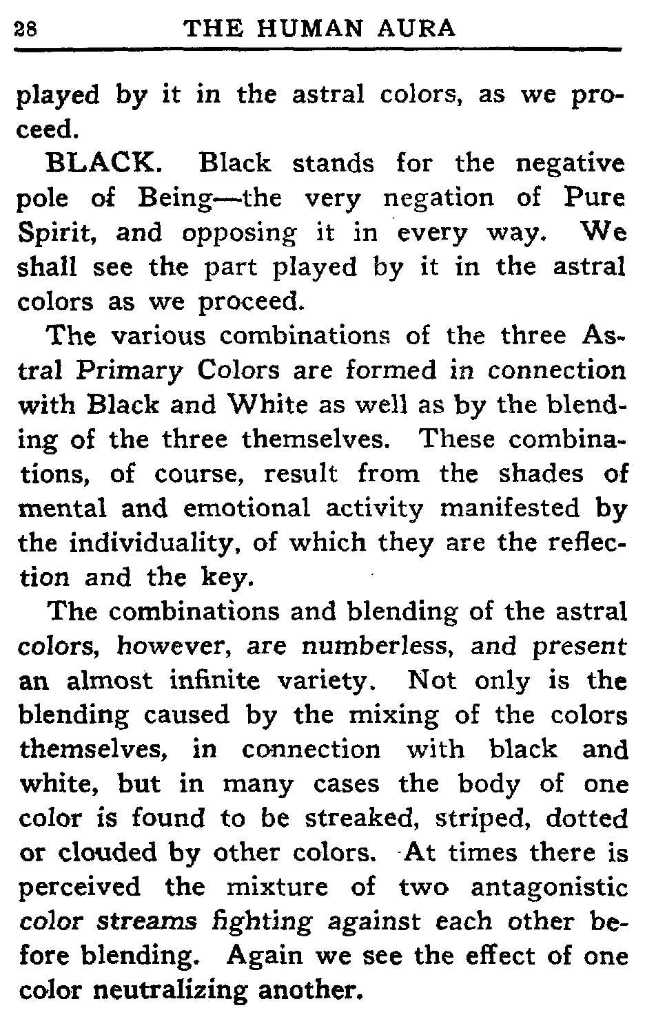 BLACK. Black stands for the negative pole of Being—the very negation of Pure Spirit, and opposing it in every way. We shall see the part played by it in the astral colors as we proceed.