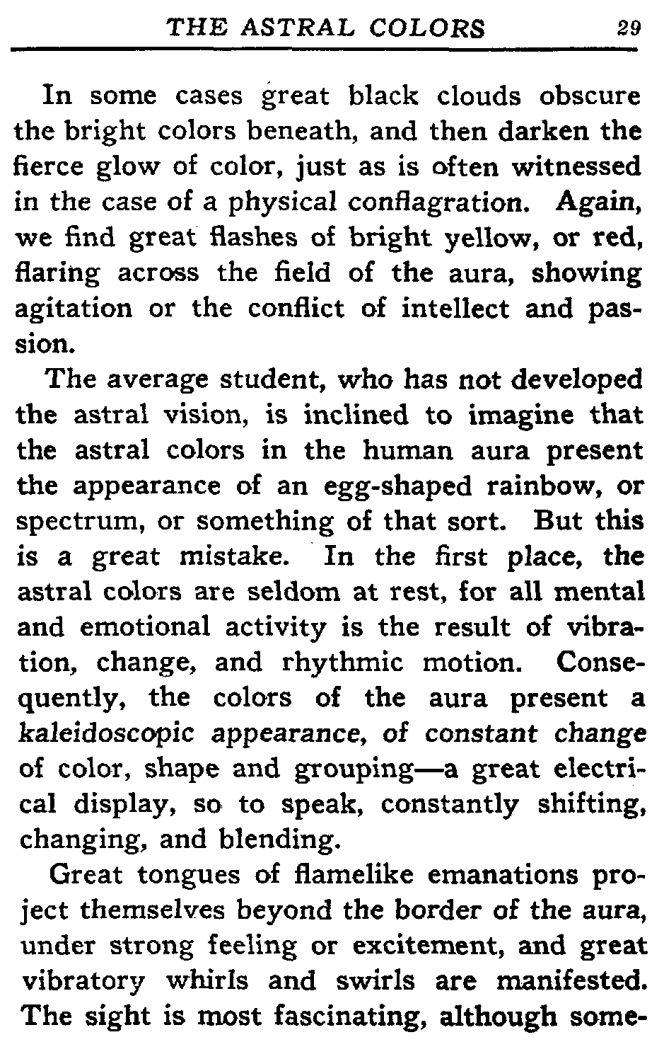 In some cases great black clouds obscure the bright colors beneath, and then darken the fierce glow of color, just as is often witnessed in the case of a physical conflagration. Again, we find great flashes of bright yellow, or red, flaring across the field of the aura, showing agitation or the conflict of intellect and passion.