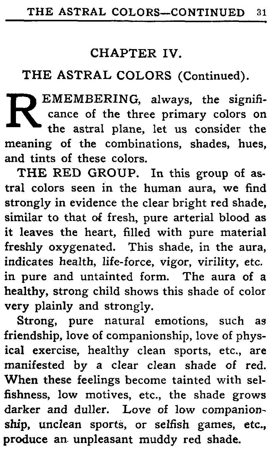 THE RED GROUP. In this group of astral colors seen in the human aura, we find strongly in evidence the clear bright red shade, similar to that of fresh, pure arterial blood as it leaves the heart, filled with pure material freshly oxygenated. This shade, in the aura, indicates health, life-force, vigor, virility, etc., in pure and untainted form. The aura of a healthy, strong child shows this shade of color very plainly and strongly.