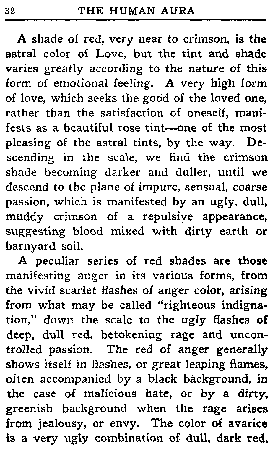 Strong, pure natural emotions, such as friendship, love of companionship, love of physical exercise, healthy clean sports, etc., are manifested by a clear clean shade of red. When these feelings become tainted with selfishness, low motives, etc., the shade grows darker and duller. Love of low companionship, unclean sports, or selfish games, etc., produce an unpleasant muddy red shade.[32]