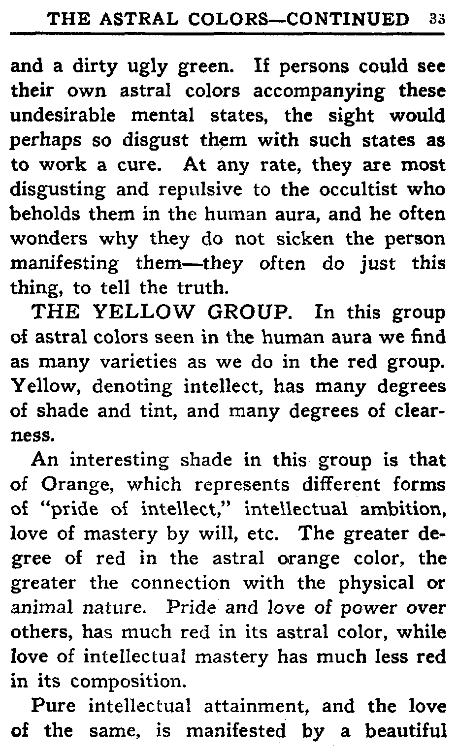 An interesting shade in this group is that of Orange, which represents different forms of "pride of intellect," intellectual ambition, love of mastery by will, etc. The greater degree of red in the astral orange color, the greater the connection with the physical or animal nature. Pride and love of power over others, has much red in its astral color, while love of intellectual mastery has much less red in its composition.