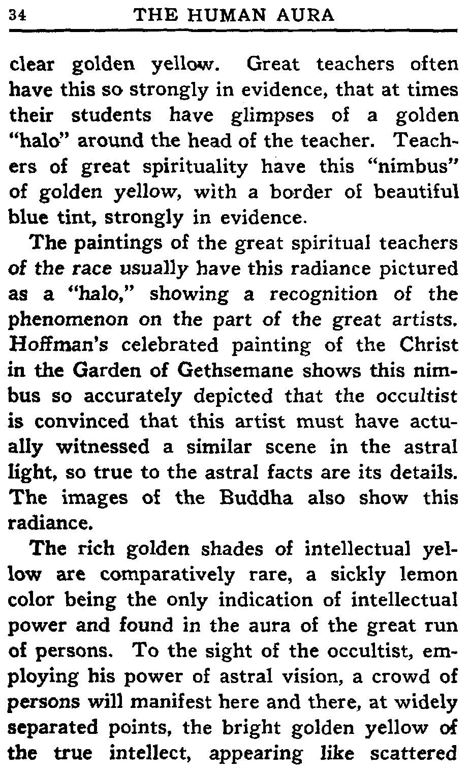 The paintings of the great spiritual teachers of the race usually have this radiance pictured as a "halo," showing a recognition of the phenomenon on the part of the great artists. Hoffman's celebrated painting of the Christ in the Garden of Gethsemane shows this nimbus so accurately depicted that the occultist is convinced that this artist must have actually witnessed a similar scene in the astral light, so true to the astral facts are its details. The images of the Buddha also show this radiance.