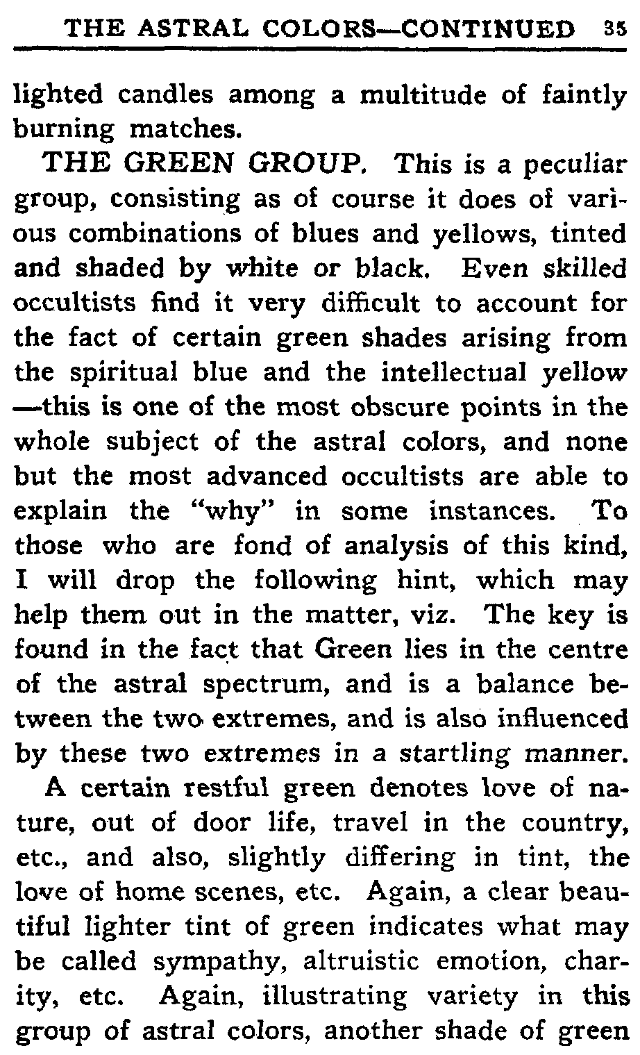 THE GREEN GROUP. This is a peculiar group, consisting as of course it does of various combinations of blues and yellows, tinted and shaded by white or black. Even skilled occultists find it very difficult to account for the fact of certain green shades arising from the spiritual blue and the intellectual yellow—this is one of the most obscure points in the whole subject of the astral colors, and none but the most advanced occultists are able to explain the "why" in some instances. To those who are fond of analysis of this kind, I will drop the following hint, which may help them out in the matter, viz. The key is found in the fact that Green lies in the centre of the astral spectrum, and is a balance between the two extremes, and is also influenced by these two extremes in a startling manner.