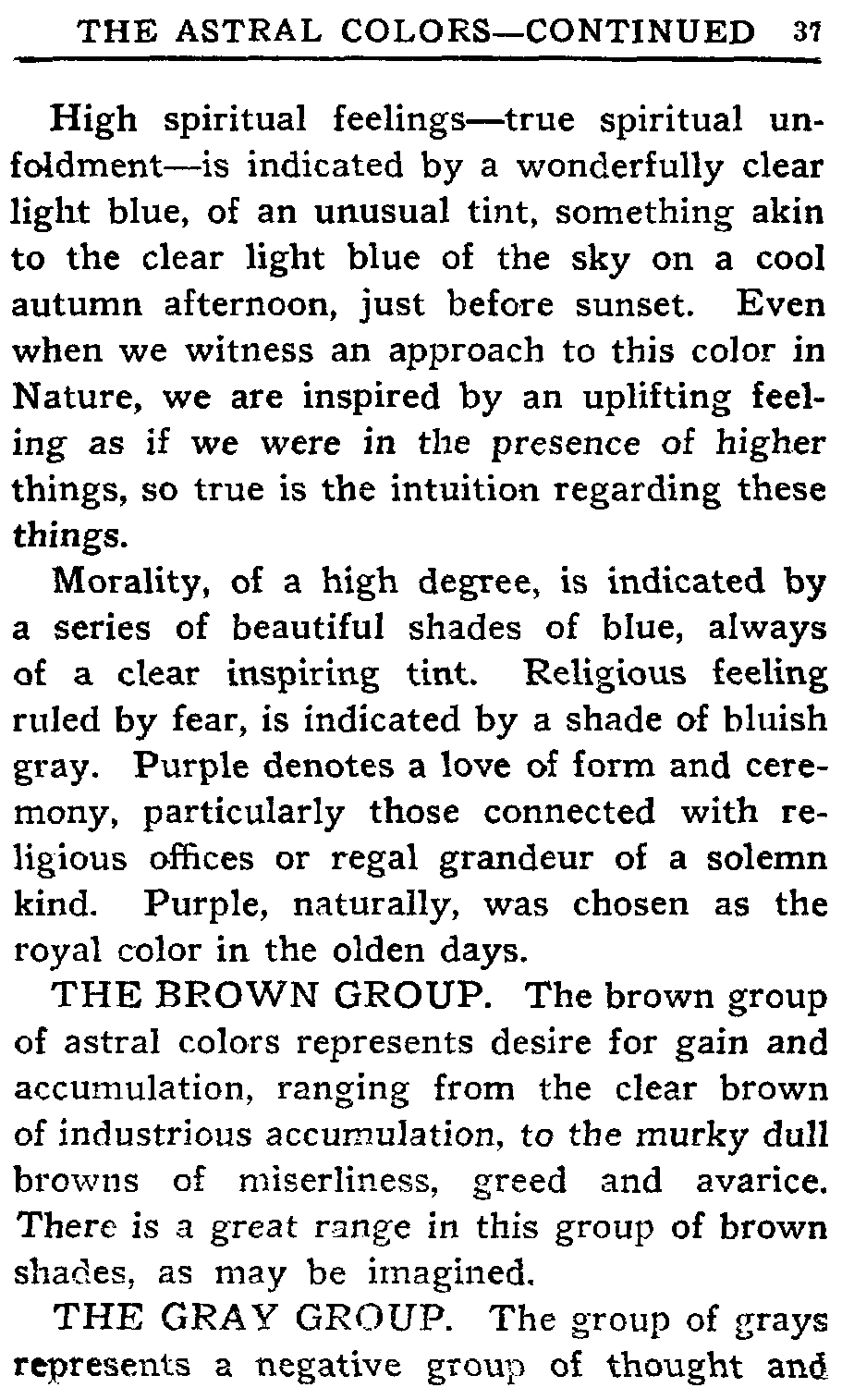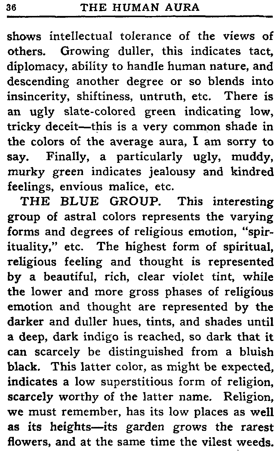 THE BLUE GROUP. This interesting group of astral colors represents the varying forms and degrees of religious emotion, "spirituality," etc. The highest form of spiritual, religious feeling and thought is represented by a beautiful, rich, clear violet tint, while the lower and more gross phases of religious emotion and thought are represented by the darker and duller hues, tints, and shades until a deep, dark indigo is reached, so dark that it can scarcely be distinguished from a bluish black. This latter color, as might be expected, indicates a low superstitious form of religion, scarcely worthy of the latter name. Religion, we must remember, has its low places as well as its heights—its garden grows the rarest flowers, and at the same time the vilest weeds.[37]