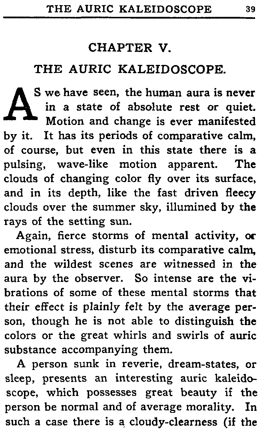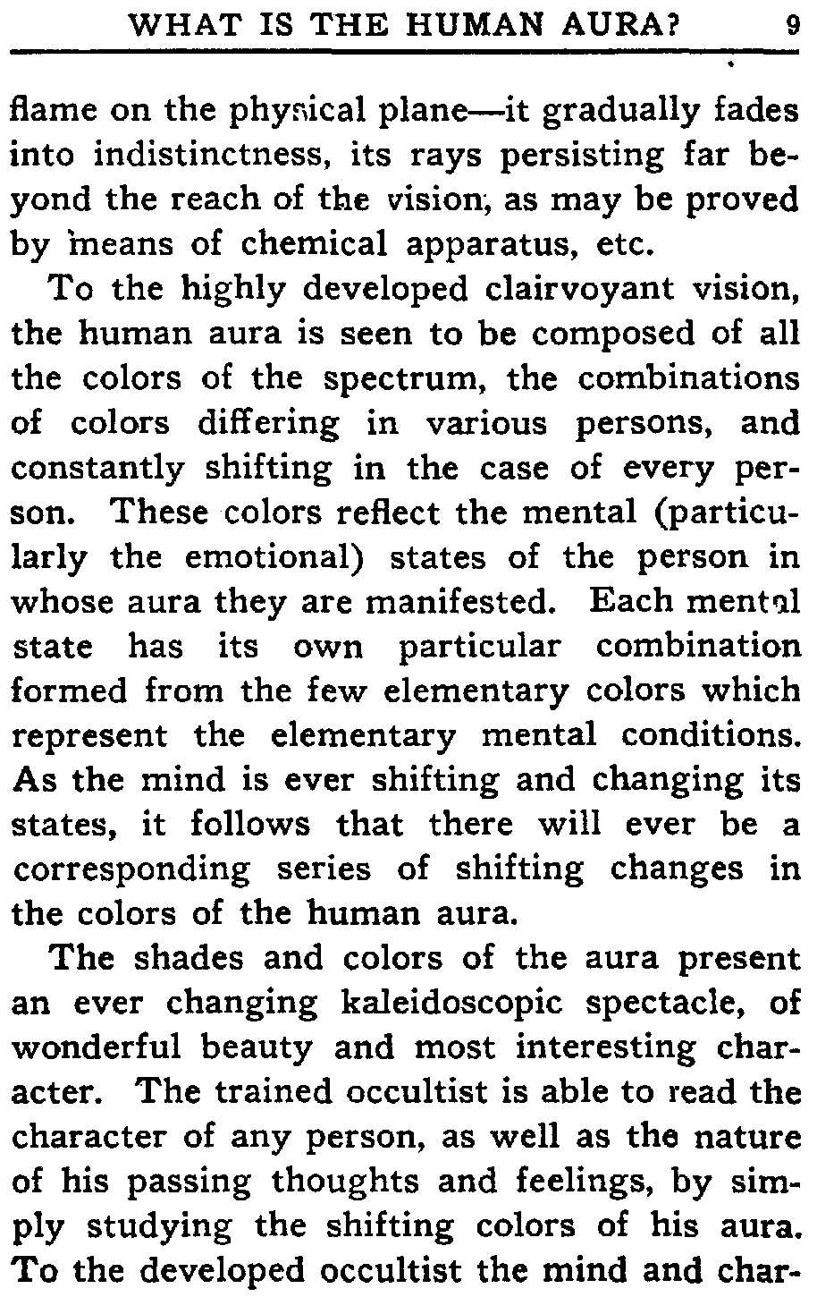 The shades and colors of the aura present an ever changing kaleidoscopic spectacle, of wonderful beauty and most interesting character. The trained occultist is able to read the character of any person, as well as the nature of his passing thoughts and feelings, by simply studying the shifting colors of his aura. To the developed occultist the mind and character[10] become as an open book, to be studied carefully and intelligently.