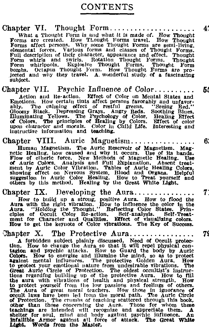 A forbidden subject plainly discussed. Need of Occult protection. How to change the Aura so that it will repel physical contagion and psychic attacks. How to Guard the body by Auric Colors. How to energize and illumine the mind, so as to protect against mental influences. The protective Golden Aura. How to protect your emotional nature from undesirable vibrations. The Great Auric Circle of Protection. The oldest occultist's instructions regarding building up of the protective Aura. How to fill the aura with vibrations of health and physical strength. How to protect yourself from the low passions and feelings of others. The Aura of great moral teachers. How those in ignorance of occult laws have been led from the moral path. The Auric Circle of Protection. The crumbs of teaching scattered through this book, other than those concerning the Aura. Those for whom these teachings are intended will recognize and appreciate them. A shelter for soul, mind and body against psychic influence. An infallible Armor against all force of attack. The Great White Light. Words from the Master.
