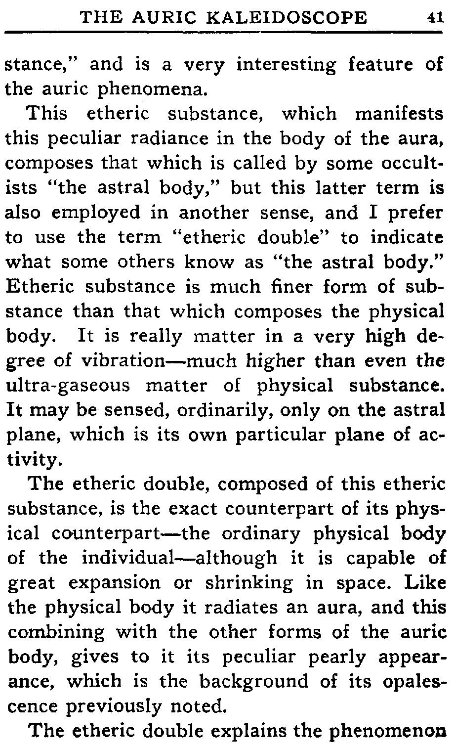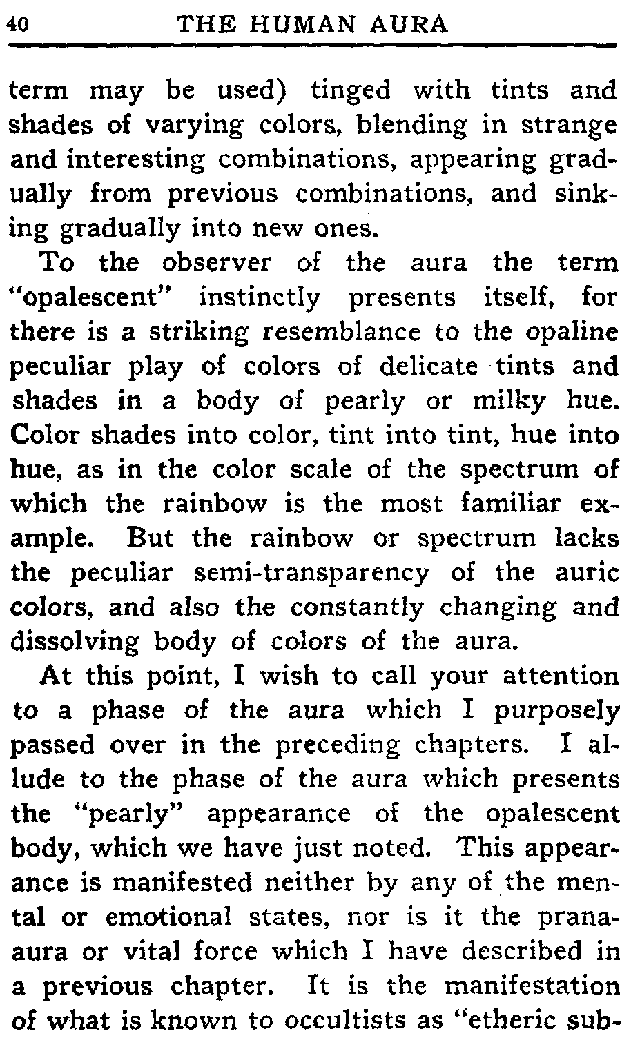 At this point, I wish to call your attention to a phase of the aura which I purposely passed over in the preceding chapters. I allude to the phase of the aura which presents the "pearly" appearance of the opalescent body, which we have just noted. This appearance is manifested neither by any of the mental or emotional states, nor is it the prana-aura or vital force which I have described in a previous chapter. It is the manifestation of what is known to occultists as "etheric substance," [41] and is a very interesting feature of the auric phenomena.