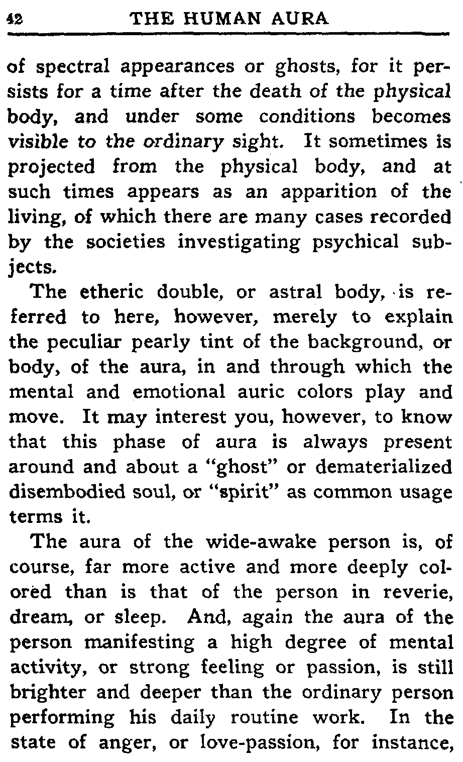The etheric double, or astral body, is referred to here, however, merely to explain the peculiar pearly tint of the background, or body, of the aura, in and through which the mental and emotional auric colors play and move. It may interest you, however, to know that this phase of aura is always present around and about a "ghost" or dematerialized disembodied soul, or "spirit" as common usage terms it.