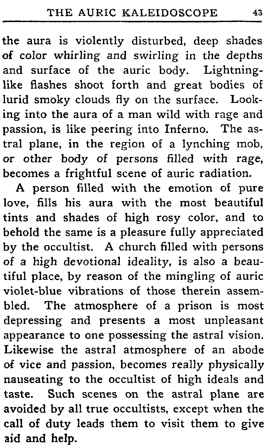 A person filled with the emotion of pure love, fills his aura with the most beautiful tints and shades of high rosy color, and to behold the same is a pleasure fully appreciated by the occultist. A church filled with persons of a high devotional ideality, is also a beautiful place, by reason of the mingling of auric violet-blue vibrations of those therein assembled. The atmosphere of a prison is most depressing and presents a most unpleasant appearance to one possessing the astral vision. Likewise the astral atmosphere of an abode of vice and passion, becomes really physically nauseating to the occultist of high ideals and taste. Such scenes on the astral plane are avoided by all true occultists, except when the call of duty leads them to visit them to give aid and help.[44]