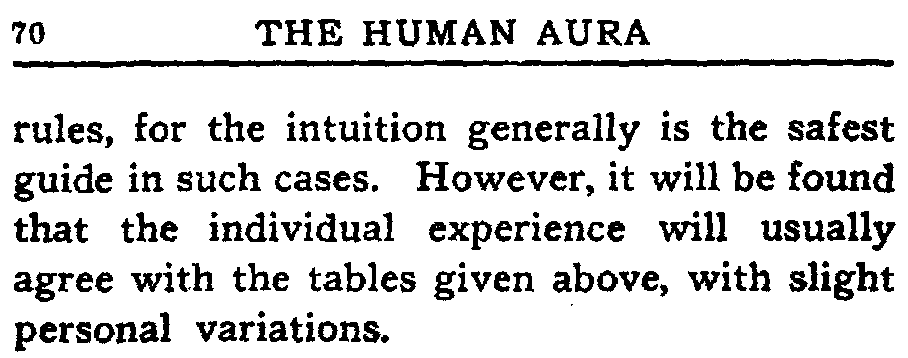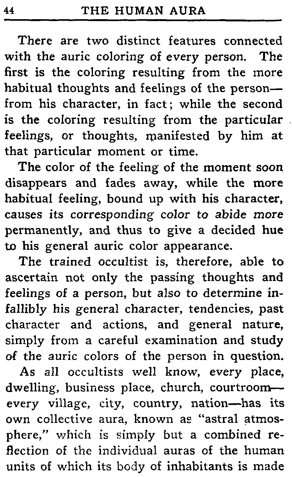 The trained occultist is, therefore, able to ascertain not only the passing thoughts and feelings of a person, but also to determine infallibly his general character, tendencies, past character and actions, and general nature, simply from a careful examination and study of the auric colors of the person in question.