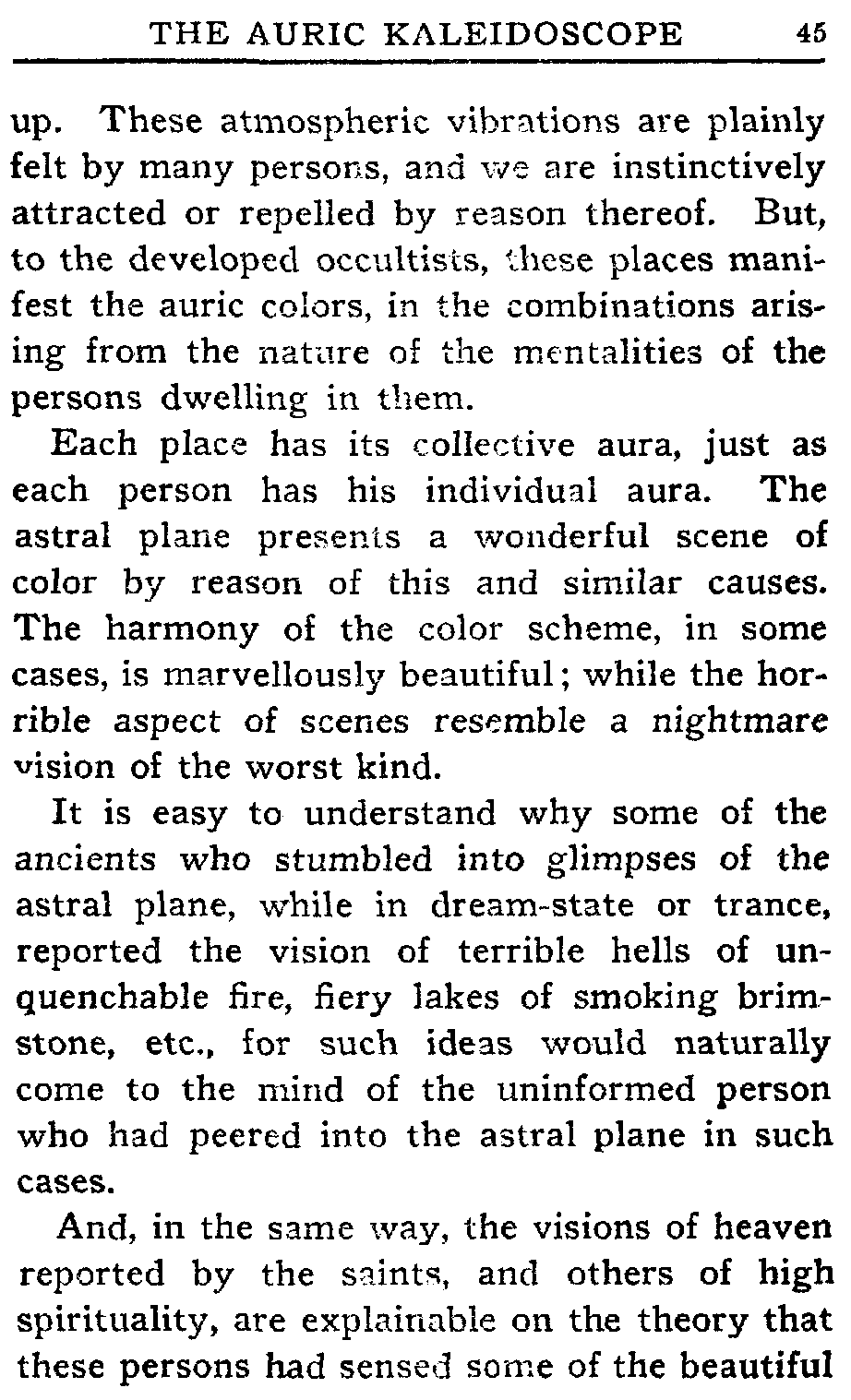 Each place has its collective aura, just as each person has his individual aura. The astral plane presents a wonderful scene of color by reason of this and similar causes. The harmony of the color scheme, in some cases, is marvellously beautiful; while the horrible aspect of scenes resemble a nightmare vision of the worst kind.